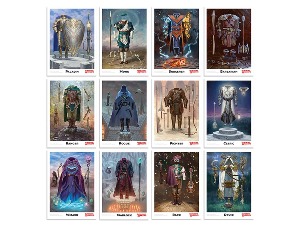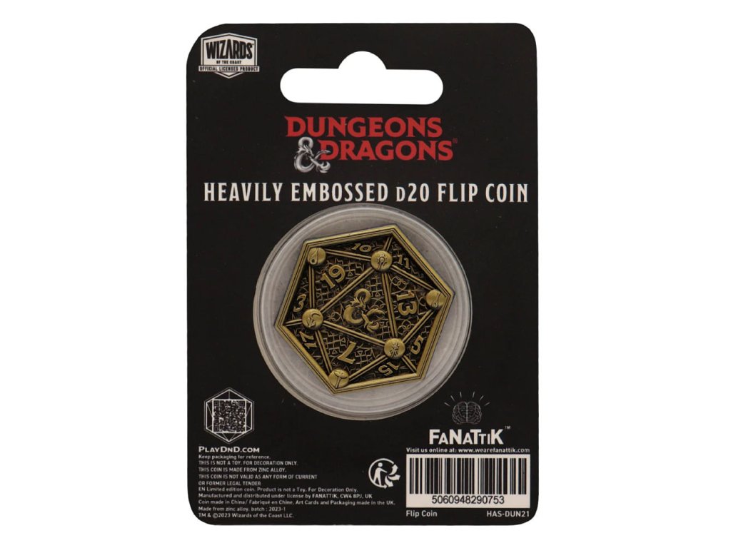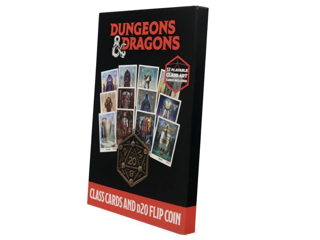 Přemýšlíš, jaké povolání v DnD zvolit pro svou postavu? A co takhle to nechat na osudu a vylosovat si náhodně jednu z 12 karet povolání? Případně gamemaster může mít karty postav z družiny u sebe a náhodně losovat, koho si nepřátelé zvolí pro svůj útok. A co třeba určovat pořadí vstupu do dungeonu přehledně na stole pomocí stylových karet? Zkrátka karty povolání s překrásnou ilustrací jsou pěkný doplněk pro hraní Dungeons & Dragons. S těmito kartami o velikosti 10,5 x 14,8 cm je v balení stylová starožitná mosazná kovová házecí mince inspirovaná D20 kostkou. Tato sběratelská mince o průměru 38 mm je dodávána v ochranném akrylovém obalu.