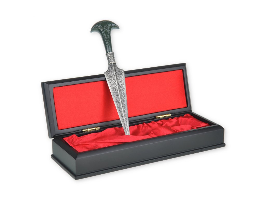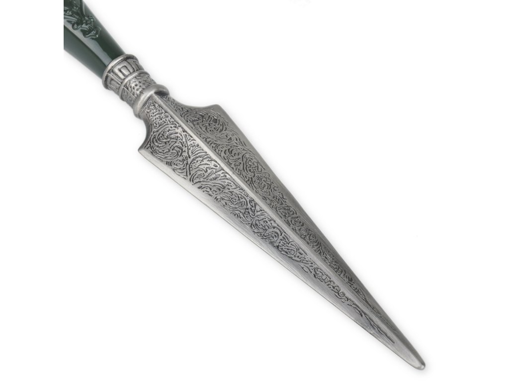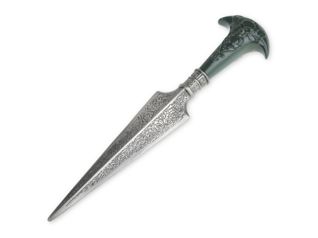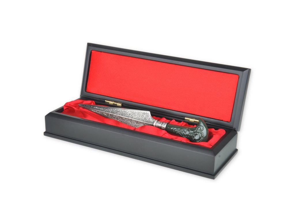 Autentická replika z filmu Harry Potter a relikvie smrti - nechvalně proslulá dýka Bellatrix Lestrangeové vyrobená z litého kovu. Délka repliky je cca 19 cm, součástí je krásná dřevěná krabička (24x5x8 cm velká).