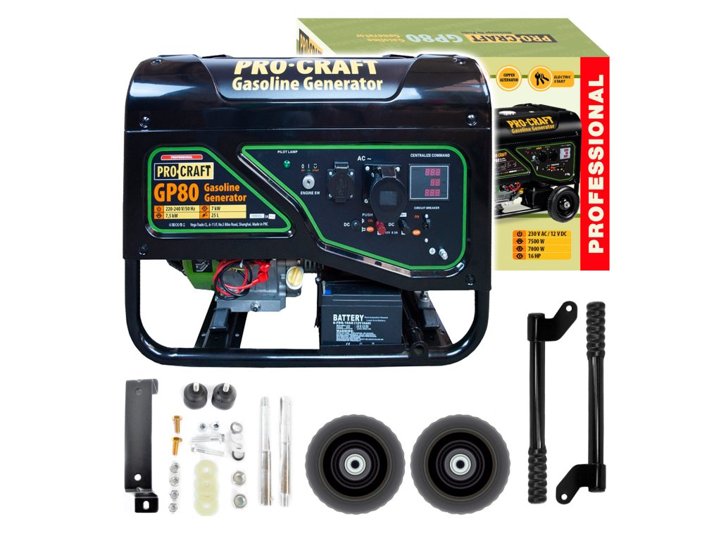 Elektrocentrála Procraft GP80 je určena k použití jako nezávislý generátor elektrického proudu při výpadcích elektřiny, jako zdroj energie při stavebnictví, v domácnosti, kde není elektrická síť dostupná. Díky vysokému výkonu umožňuje napájení nejen domácích spotřebičů, ale i spotřebičů indukčního typu. Elektrocentrála má palivovou nádrž o objemu 25l, čím zaručí dlouhý nepřetržitý provoz. Elektronický start zajišťuje rychlé spuštění benzinového motoru. Robustní ochranný rám umožňuje použití elektrocentrály v jakýkoliv podmínkách a taky usnadňuje transportování. Součástí dodávky jsou elektrická zástrčka, 2 rukojeti, 2 kola, klíč na svíčku. Balení karton. Přepětová ochrana AVR.