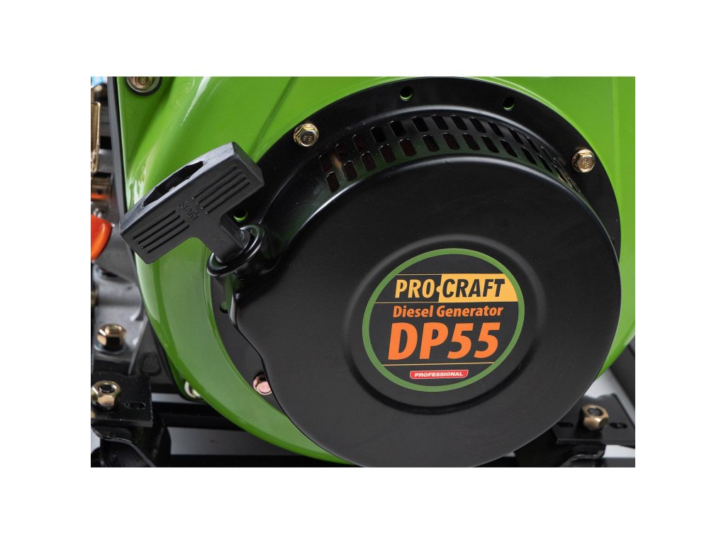 Dieselová elektrocentrála Procraft DP55 je určena k použití jako nezávislý generátor elektrického proudu při výpadcích elektřiny, jako zdroj energie při stavebnictví, v domácnosti, kde není elektrická síť dostupná. Výhodou je nižší spotřeba paliva a dlouhodobější použití než u benzinových elektrocentrál. Díky vysokému výkonu umožňuje napájení nejen domácích spotřebičů, ale i spotřebičů indukčního typu. Elektrocentrála má palivovou nádrž o objemu 12,5 l, čím zaručí dlouhý nepřetržitý provoz. Elektronický start zajišťuje rychlé spuštění benzinového motoru. Robustní ochranný rám umožňuje použití elektrocentrály v jakýkoliv podmínkách a taky usnadňuje transportování. Součástí dodávky je elektrická zástrčka, klíč na svíčku. Balení karton.