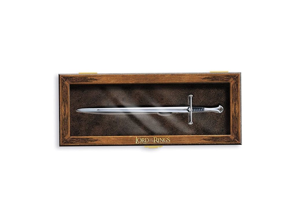 Zmenšená replika meče Narsilu podle filmového zpracování Tolkienova Pána prstenů, zbraně gondorského krále Elendila, vykované trpasličím mistrem kovářem z Nogrodu. Tímto mečem Elendil uťal Sauronovi prst. Nůž je dlouhý 22 cm, balen je v dřevěné krabičce o rozměrech 25 x 8 x 3 cm, velice věrná replika, která potěší všechny fanoušky Hobita.