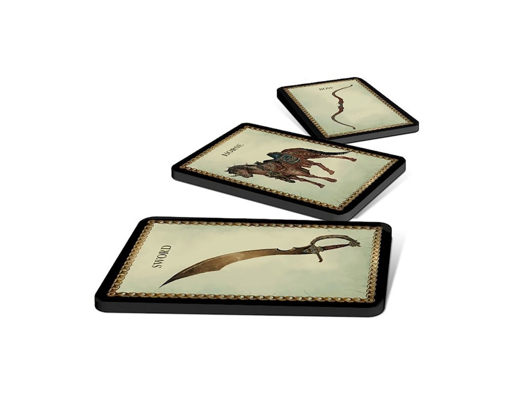 Sada Forbidden Lands - The Bloodmarch Map & Cards Pack obsahuje herní materiál pro kampaň The Bloodmarch. Obsah balení: A large, double-sided color map of the Bloodmarch (format 720 x 520 mm) A sheet of stickers for adventure sites and gravestones – transforming the map into a living, permanent chronicle of your adventures Seven custom playing cards for magical artifacts and a unique mount