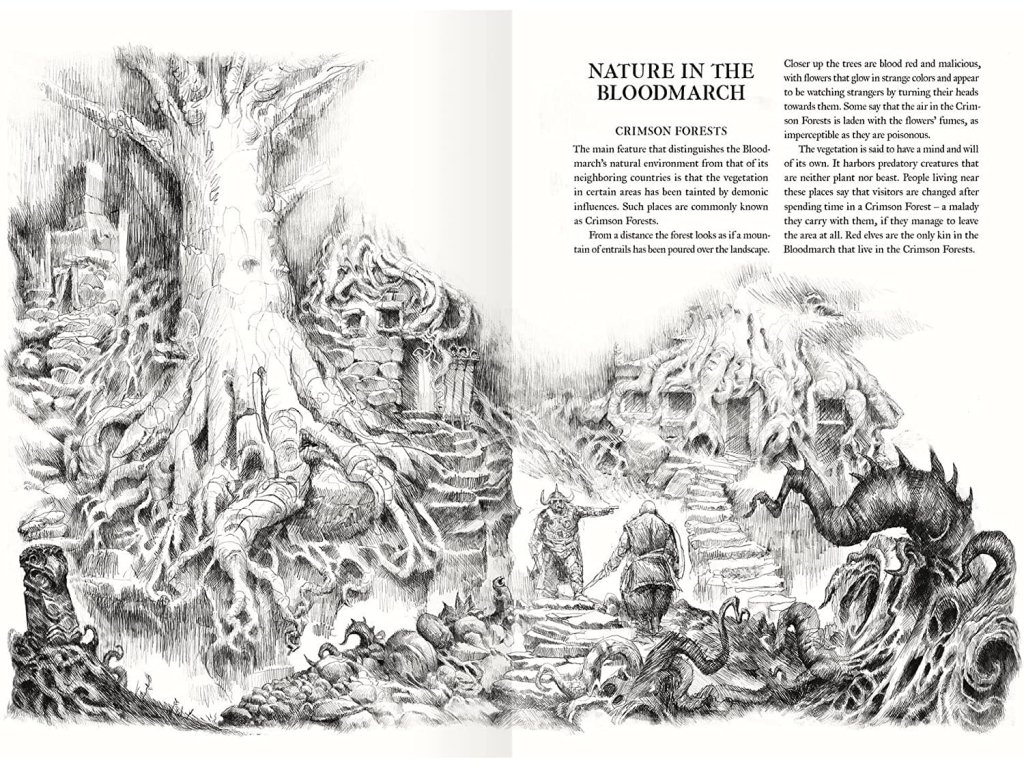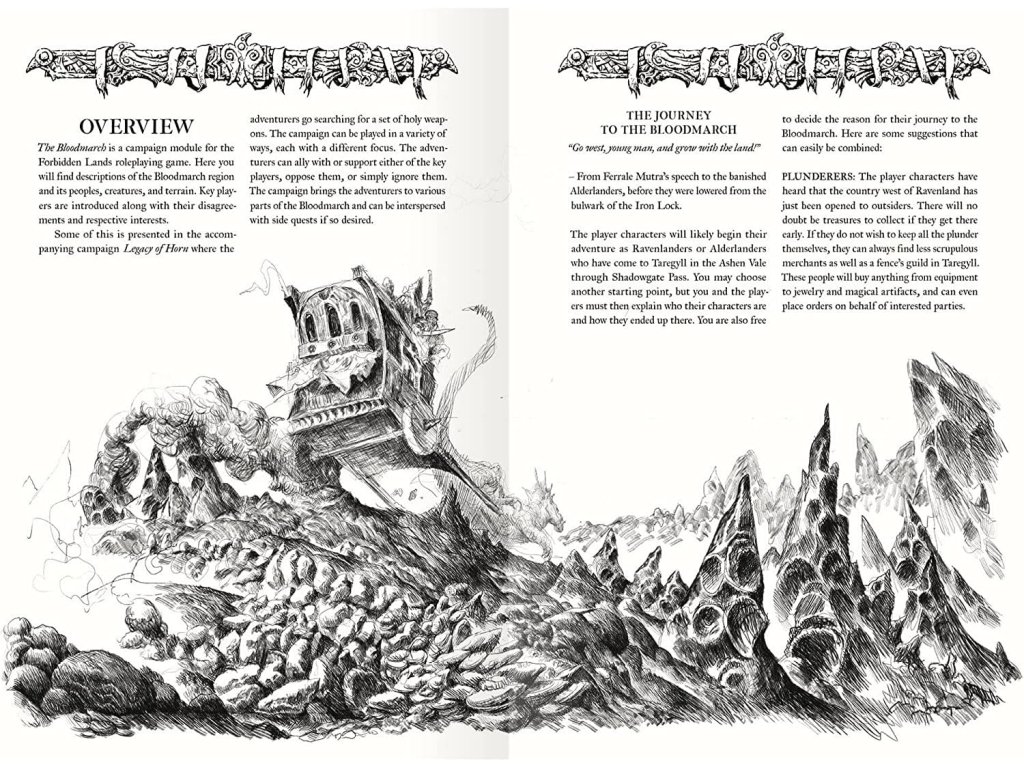 The Bloodmarch je příručka s novou herní kampaní a rozšiřujícími pravidly pro švédskou hru na hrdiny Forbidden Lands RPG. Příručka je v angličtině. Contents: Three new magic disciplines: Magma Song, Mentalism, and Dream Magic. Rules for travels in The Bloodmarch, including 27 new random encounters. 16 new monsters, including the Fire Wyrm, Salamander, and Hover Frog. The Legacy of Horn campaign, including ten key players who all seek to dominate The Bloodmarch. Eight complete, ilustrated adventure sites, playable in any order. An epic campaign finale, giving the adventurers the chance to decide the future of The Bloodmarch.