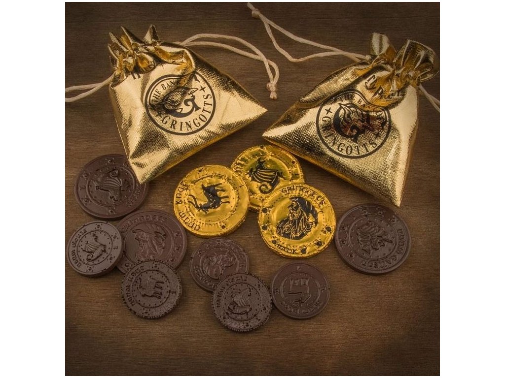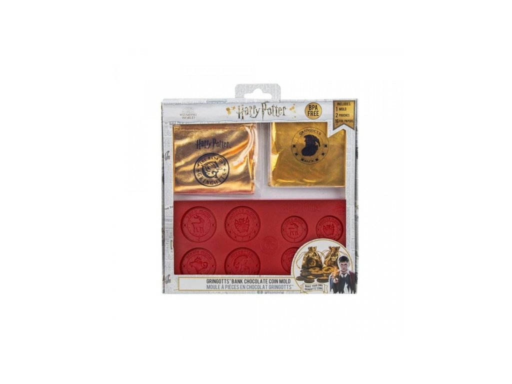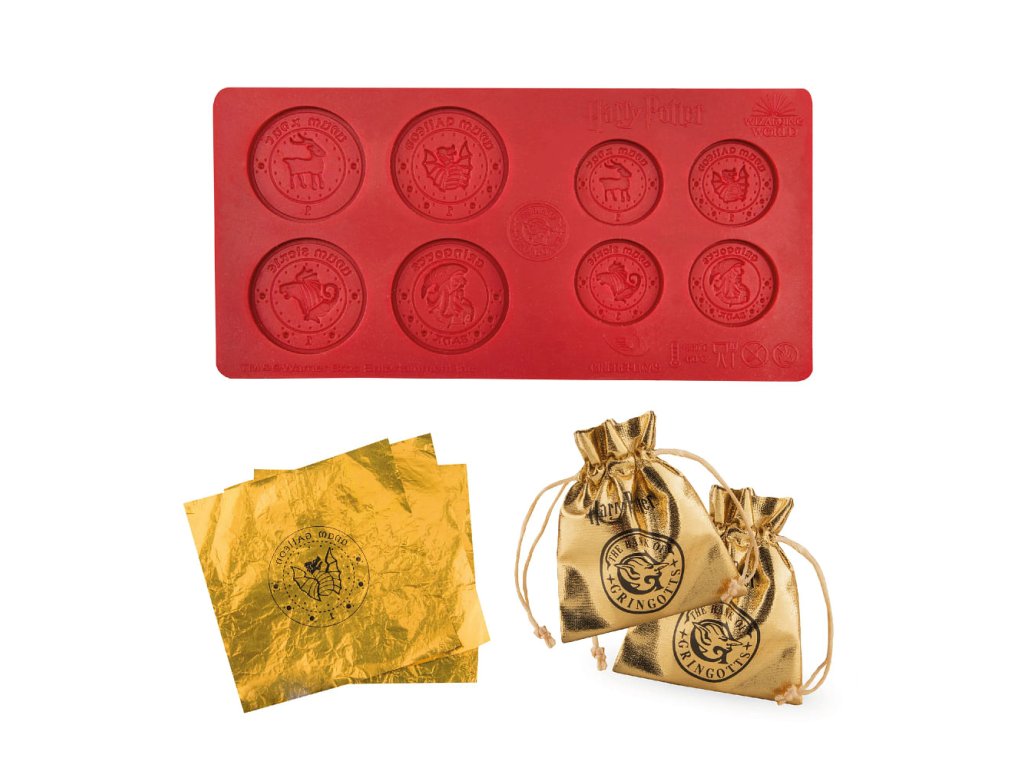 Vytvořte si mince Gringottovy banky z Harry Pottera a pak si na nich pochutnejte! Tyto silikonové formičky vám umožní vyrobit 8 mincí s různými vzory ve dvou velikostech (např. z čokolády). Podarujte kamarády skvělou potterovskou dobrotou! Součástí sady je také 16 aluminiových fólií na zabalení čokoládek, 2 váčky a instrukce v angličtině.