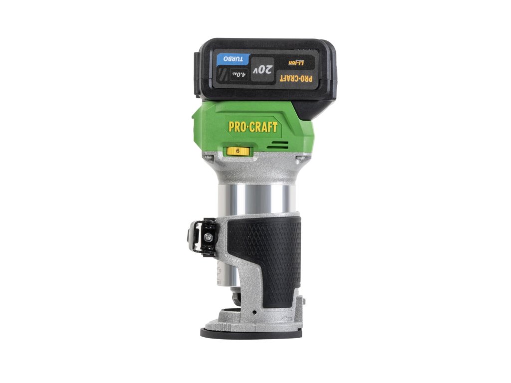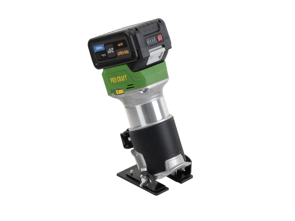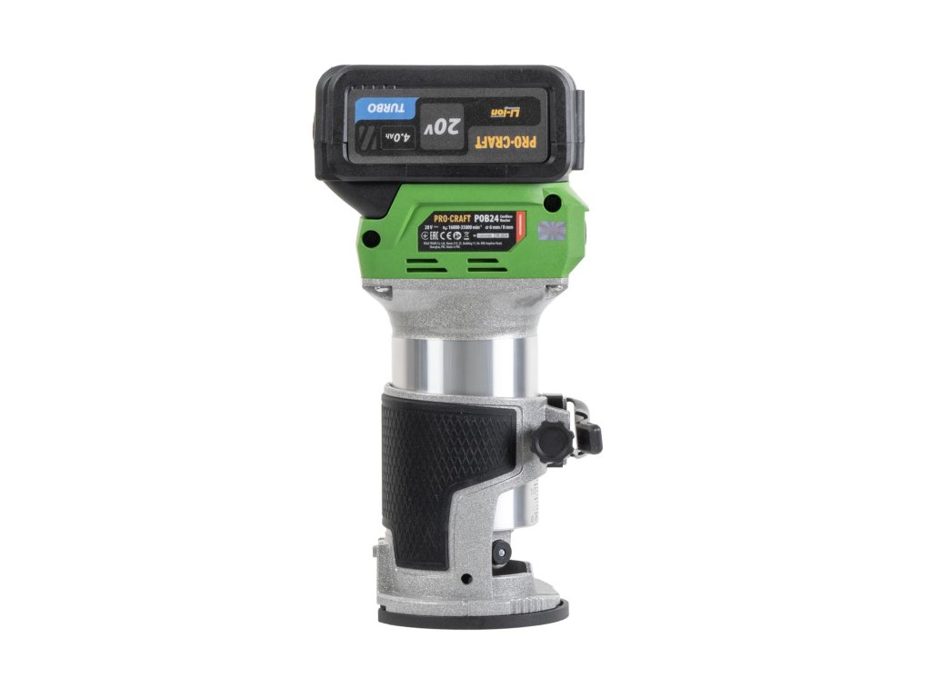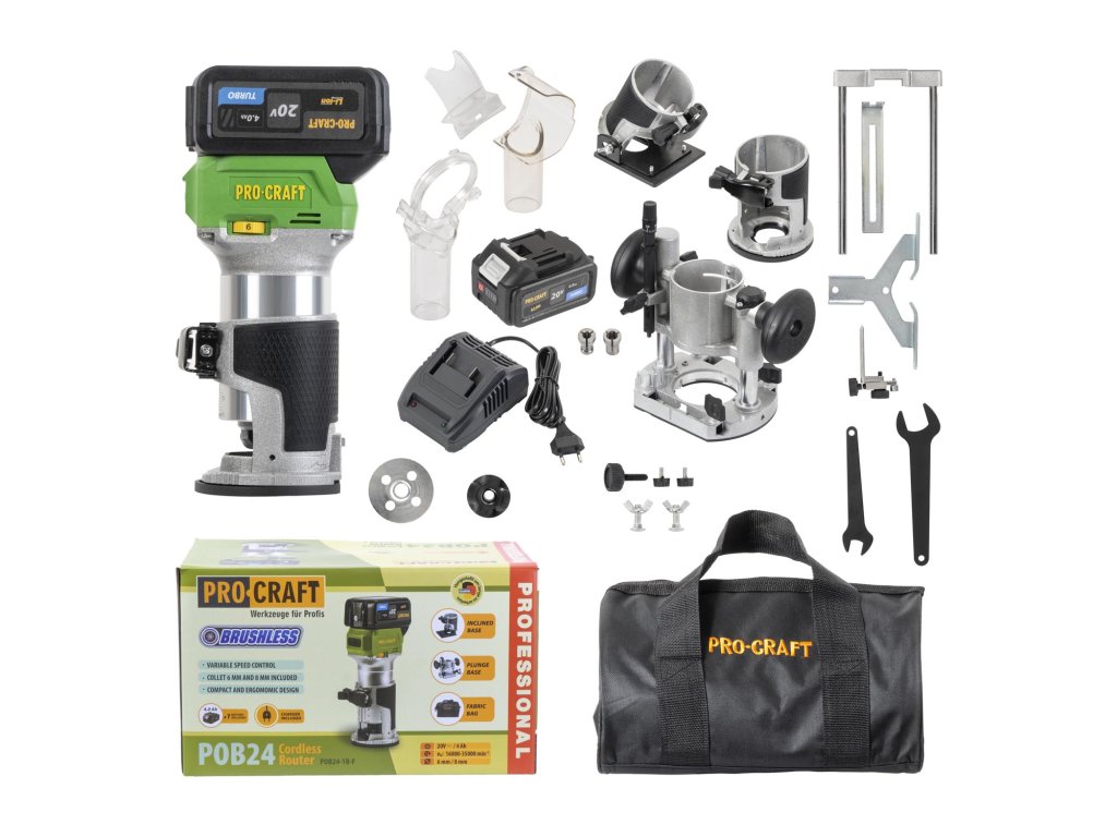 Aku horní frézka Procraft POB24 – výkonný stroj s bezuhlíkovým motorem, regulací otáček (16 000–35 000 ot./min) a kleštinami 6/8 mm. Součástí balení je podélný doraz, tři základny, baterie 20V 4Ah, nabíječka a příslušenství. Hmotnost: 2 kg.