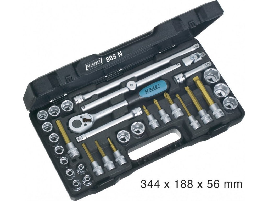 Sada nástrčných hlavic od kvalitního výrobce HAZET, 32dílná sada v plastovém kufru, nářadí 3/8", mj. ořechy, hlavice s bity, ráčna, adaptéry a T-trhák.