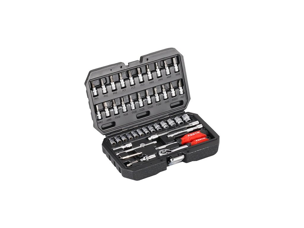 Kvalitní gola sada je vhodná díky kvalitě použitých materiálů a zpracování v profesionální autodílně nebo servisu. 10 let záruka. Všechny části jsou vyrobeny z vysoce kvalitní chrom-vanadiové oceli. Niklová povrchová úprava. Hroty bitů jsou ze slitiny oceli S2. Ráčny mají jemné dělení 72 zubů, tělo ráčny z CrV oceli, zubový mechanismus z S2 oceli, ergonomicky tvarovanou rukojeť se zdravotně nezávadnou gumou. Nový design plastového kufru z primárního materiálu s kovovými uzávěry a panty víka.