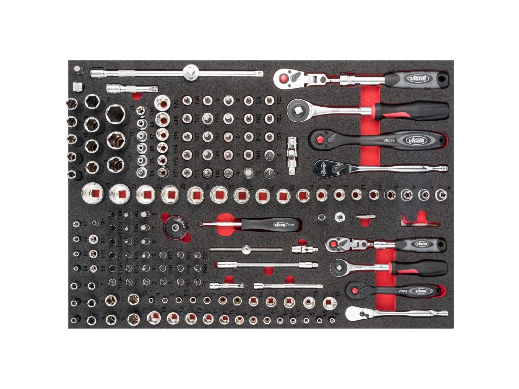 Pěnová vložka o rozměrech (š x h x v) 563 x 393 x 35 mm obsahuje celkem 165 ks profesionálních nástrčných klíčů a gola sady 1/4" a 3/8".