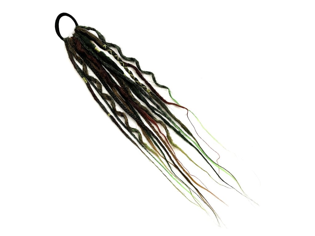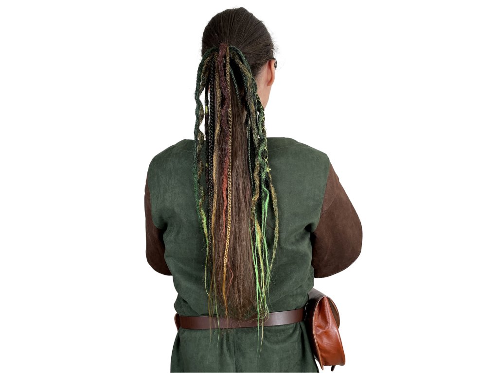 Chceš oživit svůj vzhled na cosplay akci nebo LARPové dobrodružství? Dredy Dryáda na gumičce ti dovolí okořenit svůj vizuál snadno a rychle. Zaručeně zaujmou a nemusíš si díky nim zaplétat copánky ze svých vlastních vlasů. Dohromady 15 různorodých copánků pozvedne tvůj outfit na novou úroveň a dodá mu vytoužený šmrnc. Dredy na gumičce jsou vyrobeny ze 100% kanekalonu. Prameny jsou fake dredy, které mají strukturu velmi podobnou jako pravé dredy z vlasů. U fake dredů platí pravidlo, že čím jsou starší (nošenější), tím jsou přirozenější. Jsou vyrobeny metodou háčkování. Každý pramen je natupírovaný a následně je ručně proháčkovaný jemným háčkem tak hustě dokud nevznikne celistvý dred. Následně je napařen horkou vodou a pramen se celkově zatáhne. Může se následně obtočit kolem tyčky či vařečky a nechat uschnout, tím vznikne dred vlnitý. Fake dredy jsou doplněny na oživení copánkama z kanekalonu. Dredy si můžeš ozdobit korálky, obtočit bavlnkou apod. O materiálu Kanekalon: EZ 100% Cocktail Kanekalon je typ materiálu určený na rasta copánky, twisty, připlétané copy a vysoký culík. EZ 100% Cocktail Kanekalon je možné použít i na tvorbu extravagantních účesů i příčesků. Jak se starat o příčesek - údržba: Celou gumičku s dredy stačí přelít horkou vodou z varné konvice, tím se dredy pěkně zacelí. Je možné že ten dred, který je zvlněný, se tímto narovná, ale to se dá lehce napravit. Stačí ho polít horkou vodou, namotat kolem vařečky a nechat uschnout. Také lze jednou za čas, cca 6 měsíců podle toho jak často je gumička nošená, vyprat v pračce na jemné praní max 30 stupňů a snížit otáčky na ždímání. Pak nech volně uschnout.
