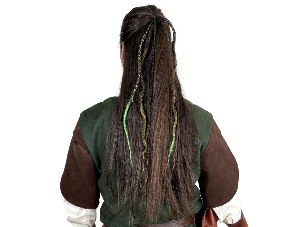 Chceš oživit svůj vzhled na cosplay akci nebo LARPové dobrodružství? Dredy Nixe na gumičce ti dovolí okořenit svůj vizuál snadno a rychle. Zaručeně zaujmou a nemusíš si díky nim zaplétat copánky ze svých vlastních vlasů! Dredy na gumičce jsou vyrobeny ze 100% kanekalonu. Prameny jsou fake dredy, mají strukturu velmi podobnou jako pravé dredy z vlasů. U fake dredů platí pravidlo, že čím jsou starší (nošenější), tím jsou přirozenější. Jsou vyrobeny metodou háčkování. Každý pramen je natupírovaný a následně je ručně proháčkovaný jemným háčkem tak hustě dokud nevznikne celistvý dred. Následně je napařen horkou vodou a pramen se celkově zatáhne. Může se následně obtočit kolem tyčky či vařečky a nechat uschnout, tím vznikne dred vlnitý. Fake dredy jsou doplněny na oživení copánkama z kanekalonu. Dredy si můžeš ozdobit korálky, obtočit bavlnkou apod. O materiálu Kanekalon: EZ 100% Cocktail Kanekalon je typ materiálu určený na rasta copánky, twisty, připlétané copy a vysoký culík. EZ 100% Cocktail Kanekalon je možné použít i na tvorbu extravagantních účesů i příčesků. Jak se starat o příčesek - údržba: Celou gumičku s dredy stačí přelít horkou vodou z varné konvice, tím se dredy pěkně zacelí. Je možné že ten dred, který je zvlněný, se tímto narovná, ale to se dá lehce napravit. Stačí ho polít horkou vodou, namotat kolem vařečky a nechat uschnout. Také lze jednou za čas, cca 6 měsíců podle toho jak často je gumička nošená, vyprat v pračce na jemné praní max 30 stupňů a snížit otáčky na ždímání. Pak nech volně uschnout.