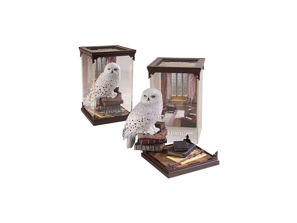 Soška sovy Hedviky ze světa kouzelnického učně Harryho Pottera, ve vitríně. Soška má rozměry cca 10,5 cm na šířku a 18,5 cm na výšku. Obsah vitríny lze vyjmout. Sovu Hedviku dostal Harry od Hagrida ke svým jedenáctým narozeninám.