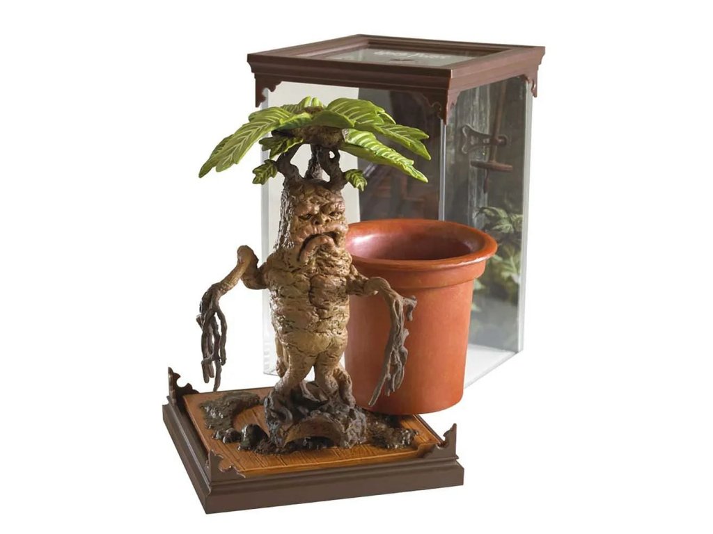 Pěkná soška Mandragory (Mandrake) z magického světa Harry Pottera od J. K. Rowlingové se nachází v diorama uvnitř vitríny, odkud ji lze vyjmout.