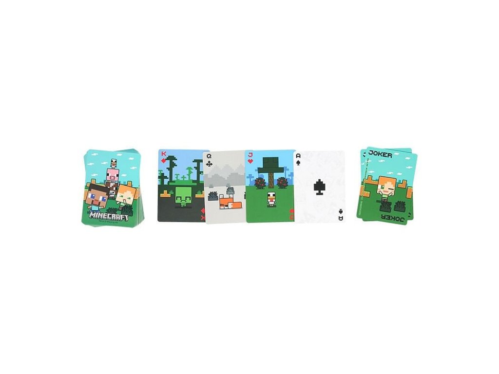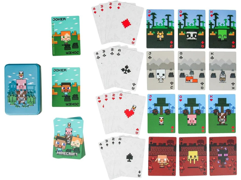 Uvnitř hezké a praktické plechovky najdeš hrací karty se zvířátky a dalšími postavami z kostičkového světa videohry Minecraft. Zahraj si svou oblíbenou karetní hru, ať už doma s rodinou nebo třeba na cestách s přáteli! V krabička obsahuje 52 karet (+2 žolíci).