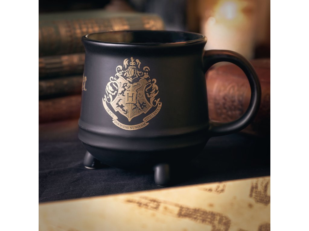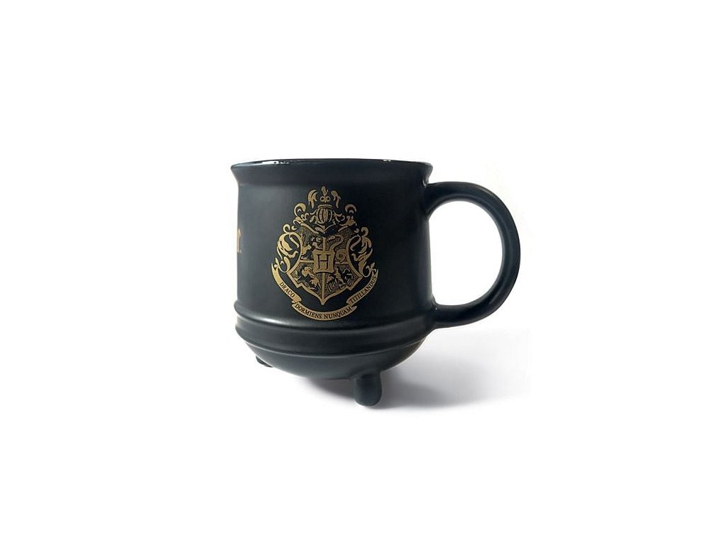 Keramický černý hrnek v podobě kouzelnického kotlíku a s erbem Bradavic, školy čar a kouzel v příbězích o Harry Potterovi.