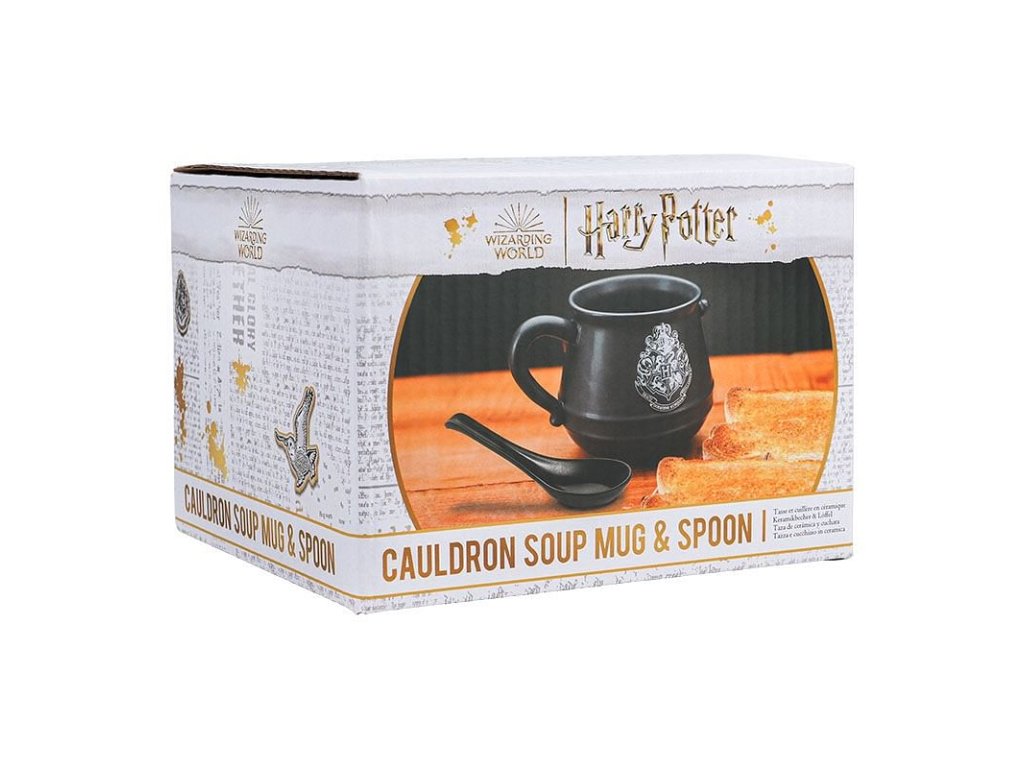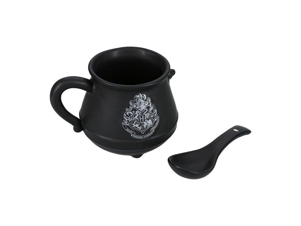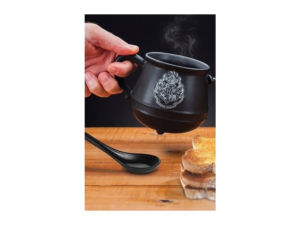 Černý keramický hrnek v podobě magického kotlíku zdobí znak školy čar a kouzel v Bradavicích z Harryho Pottera a hodí se třeba na polévku. Součástí je keramická lžíce.