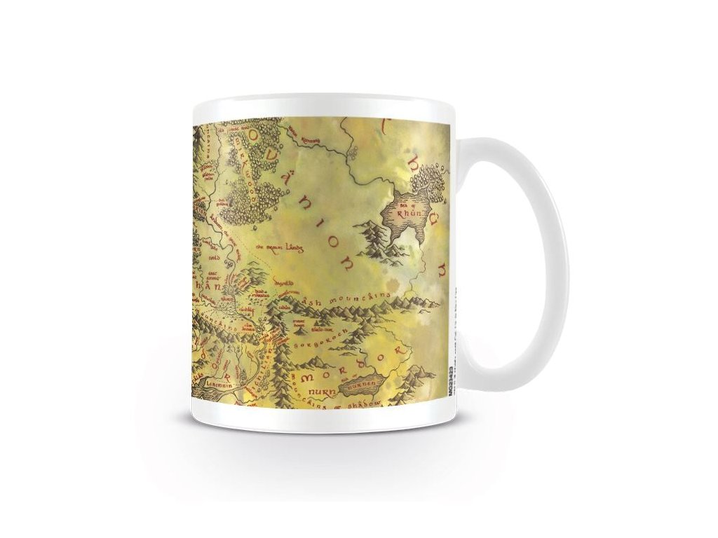 Napijte se něčeho dobrého a nechte se unášet fantazií v krajích na mapě Středozemě ze světa Pána prstenů a Hobita, která zdobí tento pěkný hrnek.