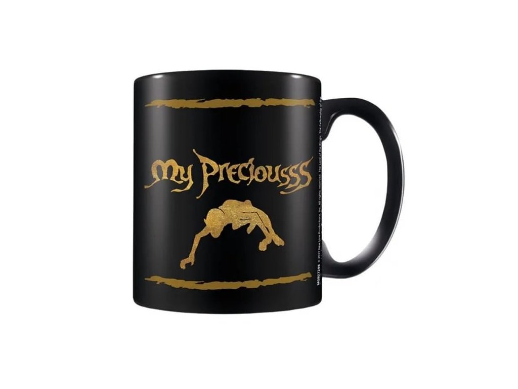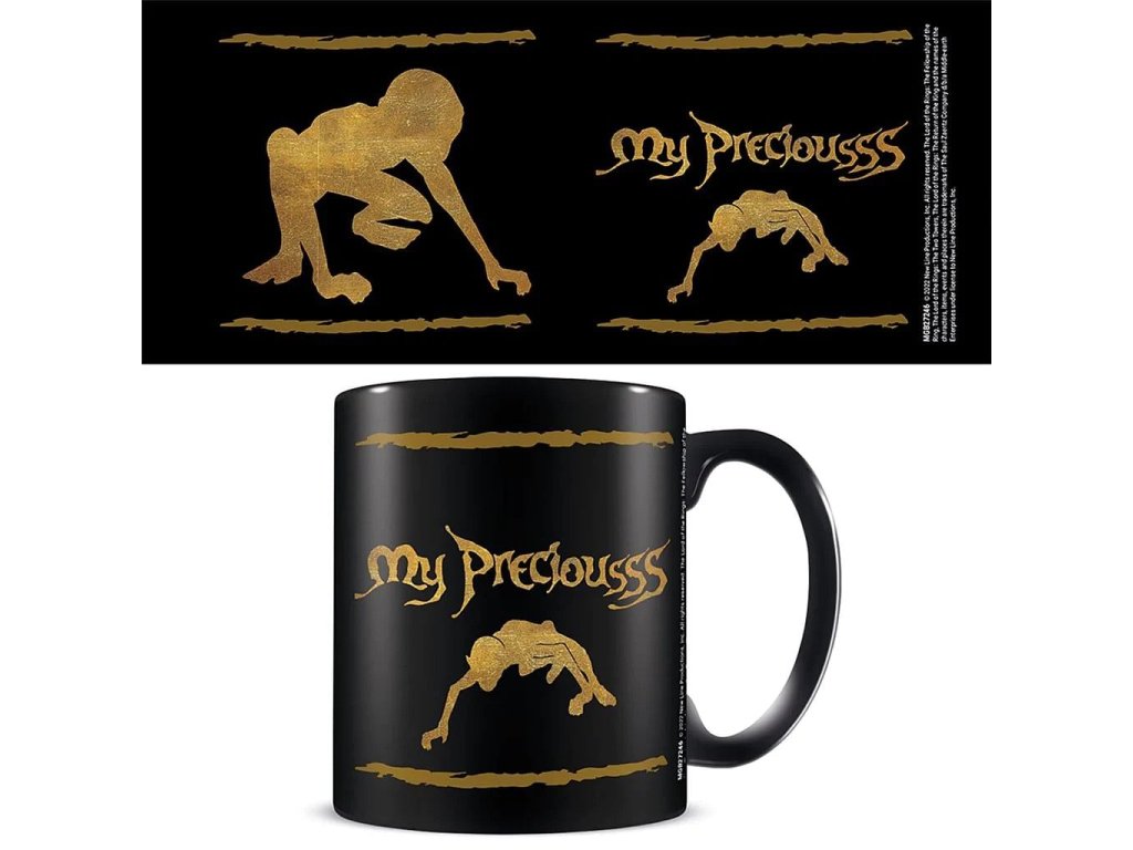 Hezký černý hrnek se zlatou siluetou Gluma z fantasy trilogie Pán prstenů a jeho slovy: My preciousss - Můj milášek. Hrnek, který si zamilujete!