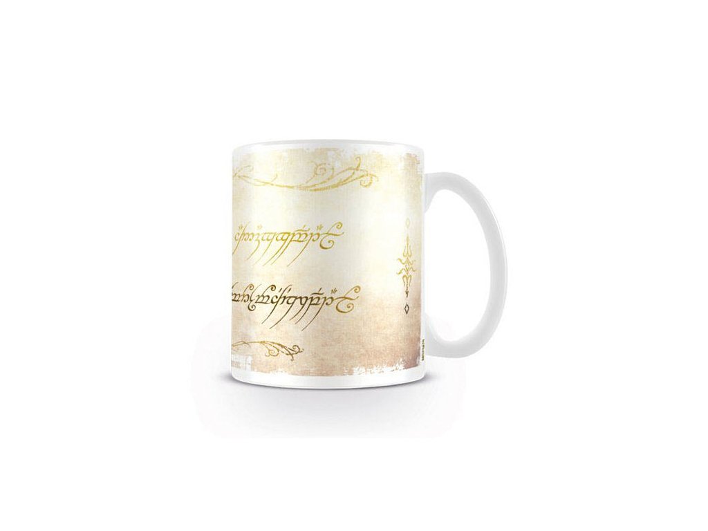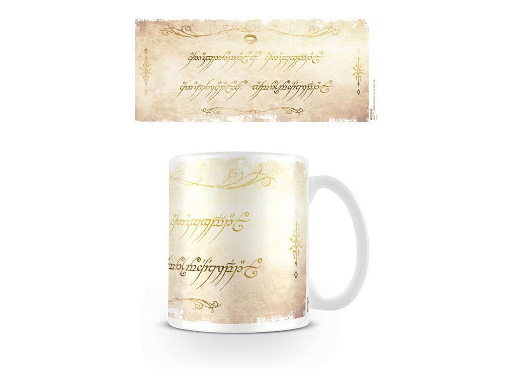 Jeden hrnek vládne všem, Jeden jim všem káže, Jeden všechny přivede, do temnoty sváže... Hrníček s nápisy Glumova miláška - Jednoho prstenu z Tolkienova Pána prstenů.