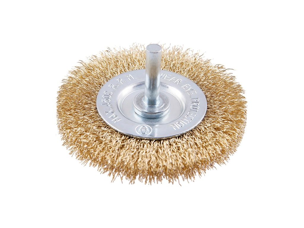 Rotační kartáč - okružní, provedení : vlnitý drát 0,25 mm - pomosazený, průměr 75mm, stopka 6 x 27 mm, pozinkované tělo kartáče, počet drátů : 1728, délka drátu:16mm, max. přípustné otáčky : 4500 1/min, použití : pro leštění, zdrsňování, ostranění rzi a otřepů, balení : blistr s eurootvorem.