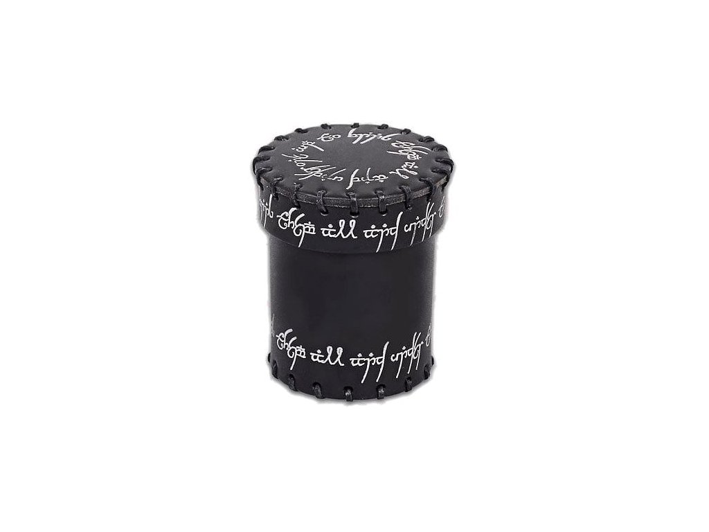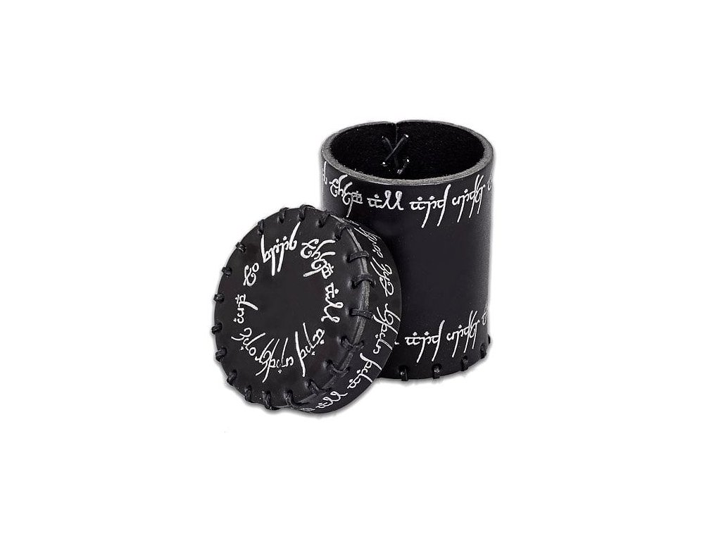 Kožený kelímek na kostky s víčkem, vyrobený ze 4 mm hrubé kůže obarvené na černo, velikost 7x8 cm. Je zdoben stříbrným elfským písmem známým z Tolkienova Pána prstenů. Písmo je do kůže vyraženo a stříbrně nabarveno, takže vydrží mnohé zacházení! Kelímek je skvělý kupříkladu pro dokreslení atmosféry při hraní her na hrdiny.