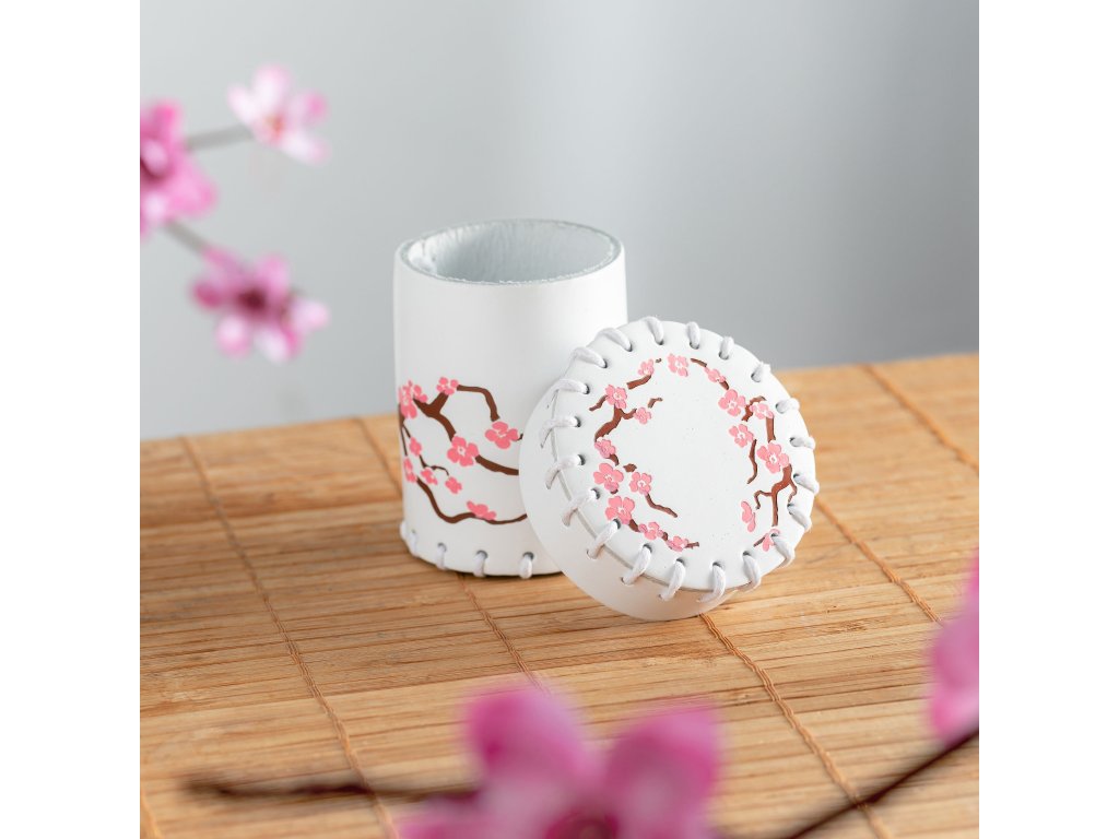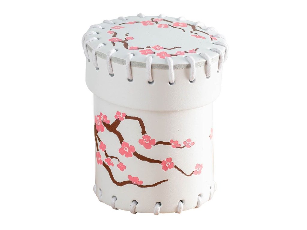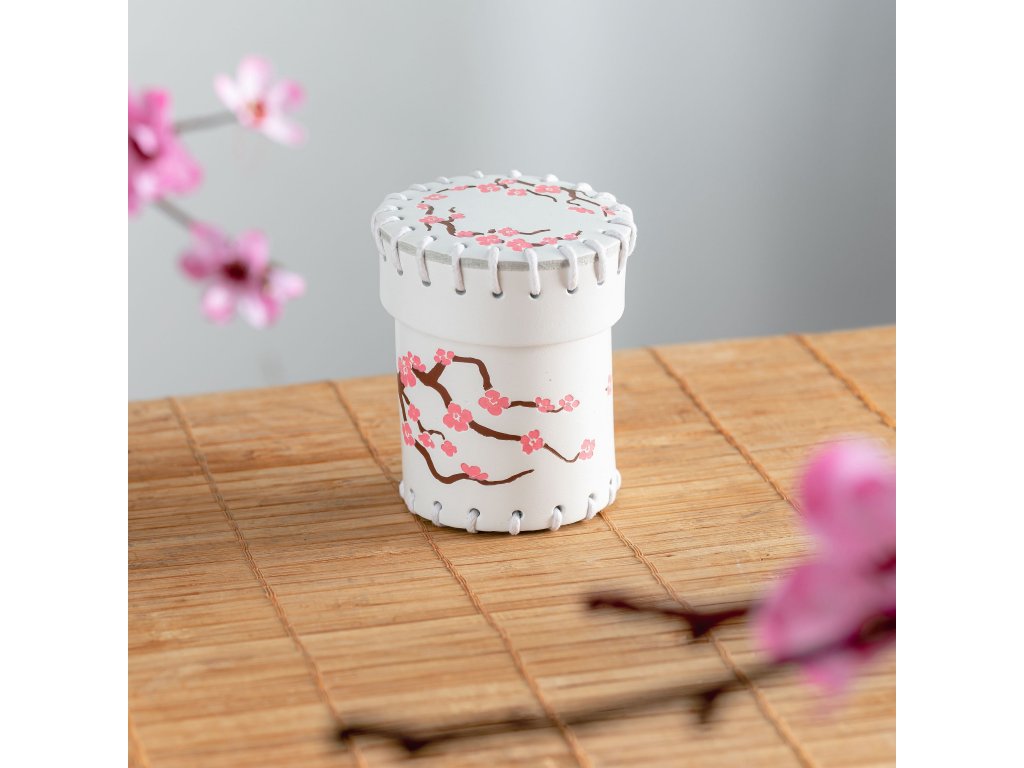 Krásný kožený kelímek na kostky v japonském stylu zdobí květy sakury. Dopřejte svým kostkám orientální krásu a eleganci!