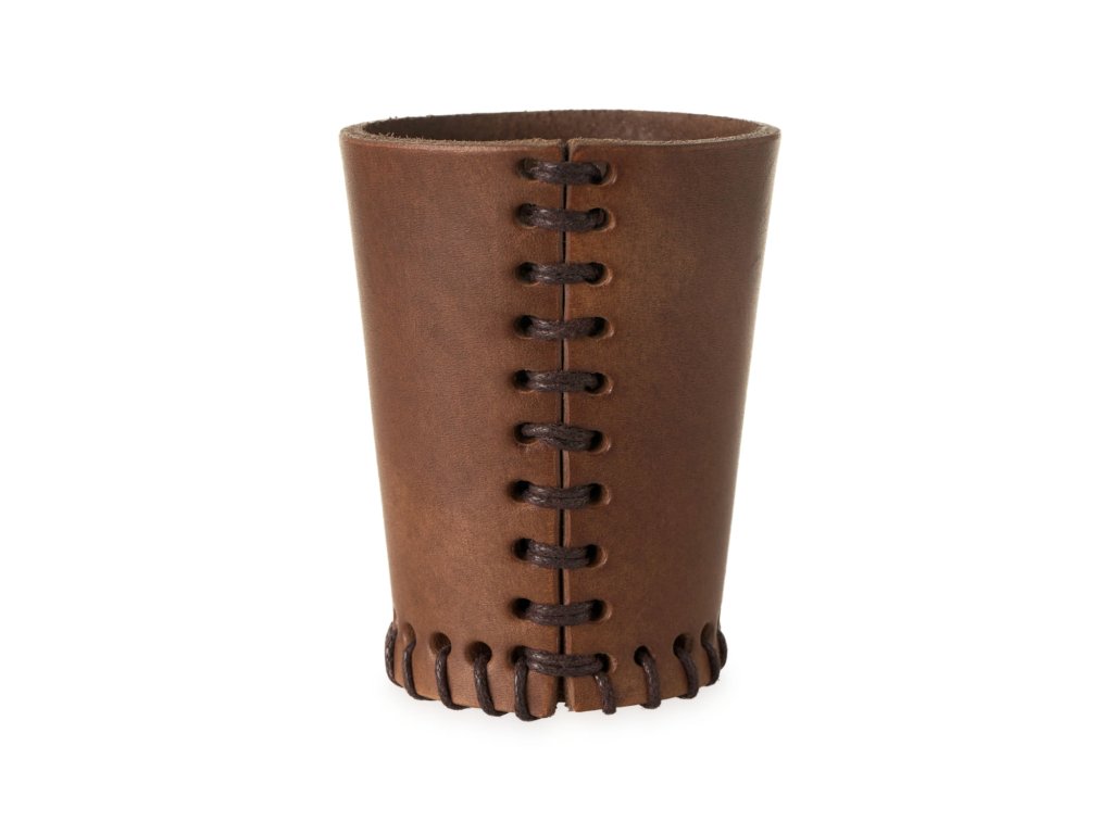 Kožený kelímek na vrhání kostek s smotivem hry na hrdiny Jeskyně a draci. Hodí se nejen k hraní tohoto RPG, ale i při jakýchkoli hrách, kde se hází kostkami. Kelímek je vyroben ručně v naší dílně z přírodní hovězí kůže dobarvené hnědou barvou, sešněrovaný je pevnou voskovanou šňůrkou a zdobí jej vytlačený motiv JaD.