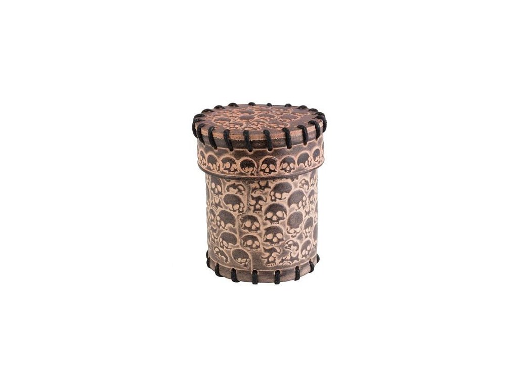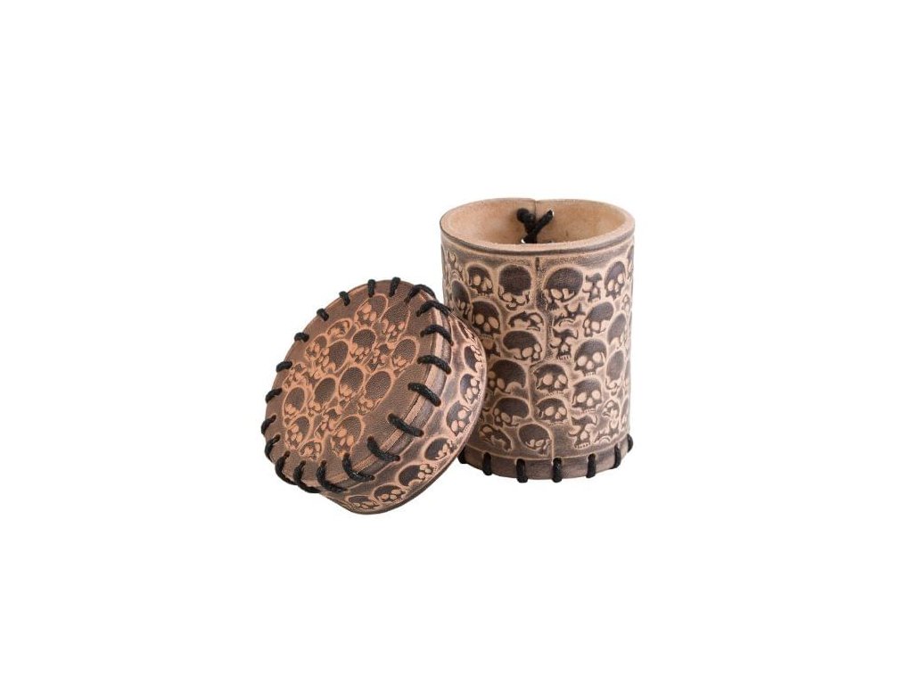 Kožený béžový kelímek na kostky s lebkami, jeho kapacita je až 21 kostek. Rozměry: 8,5 x 5,5 cm.