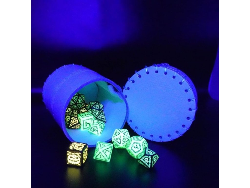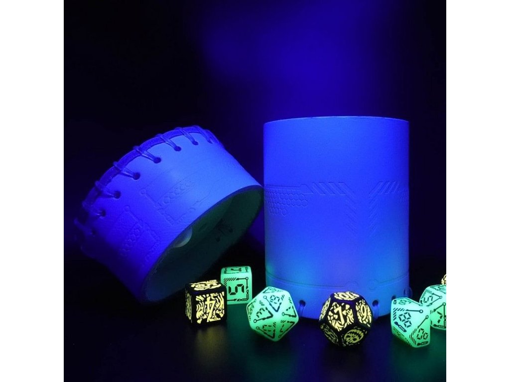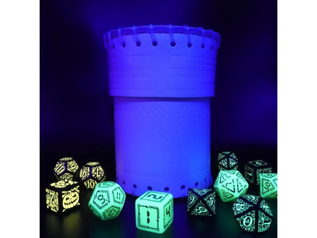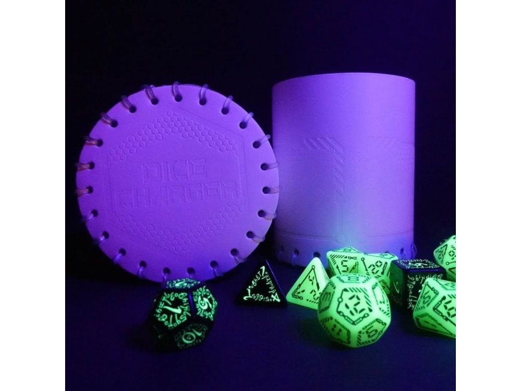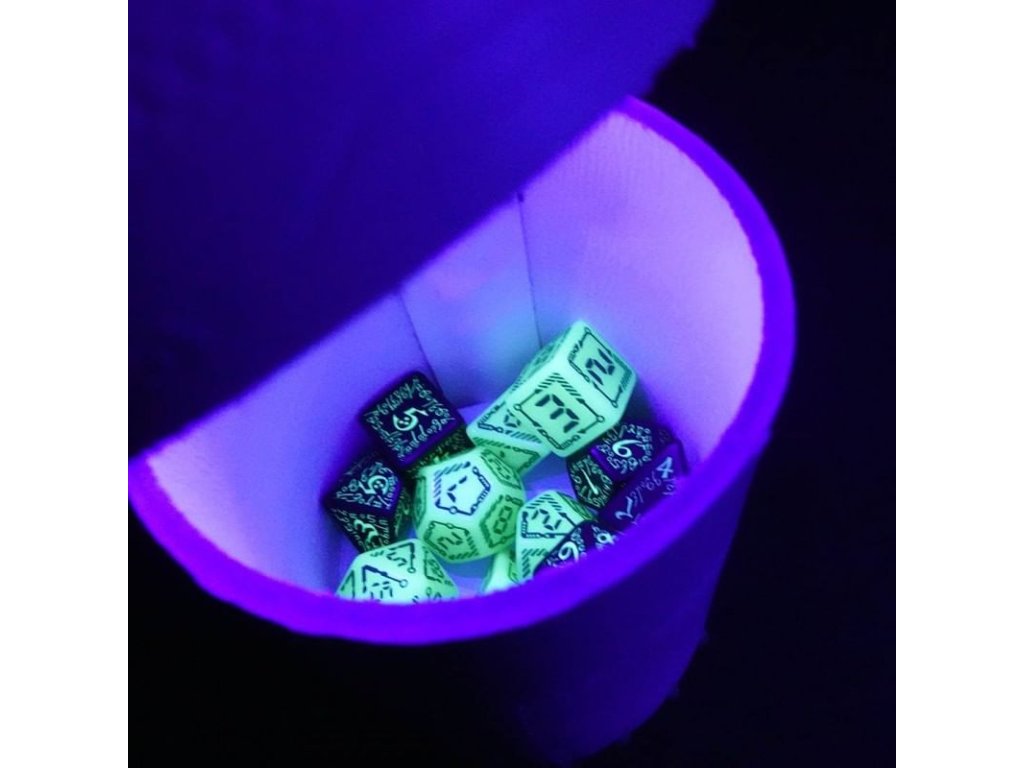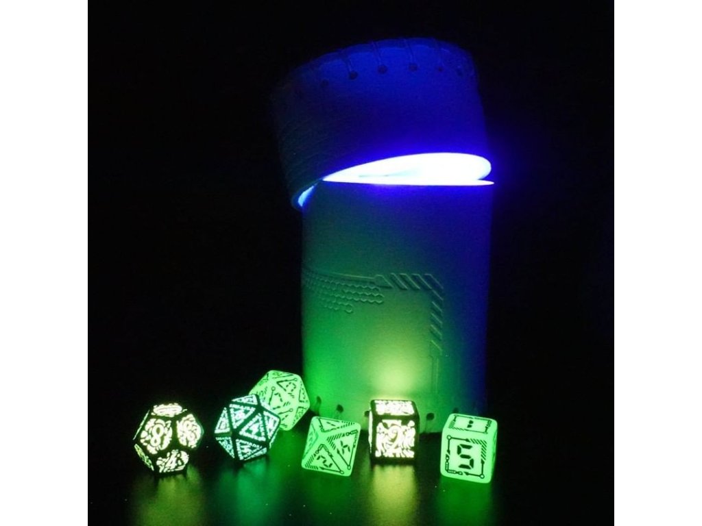 Tento jedinečný kelímek s vyjímatelným UV nasvěcovačem je vhodný pro všechny kostky, které svítí ve tmě. Stačí jen zatřást a kelímek nabije vaše kostky mocným UV světlem. Napájeno pomocí 3 ks baterie AAA (nejsou součástí balení).