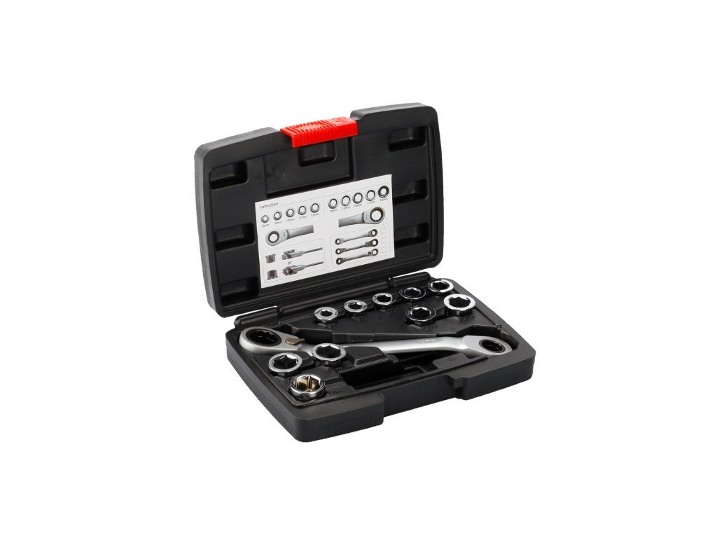 - výhodná kompaktní sada 12ti ráčnových klíčů, jednoduchá a rychlá změna požadovaného rozměru klíče - vsunutím vložky