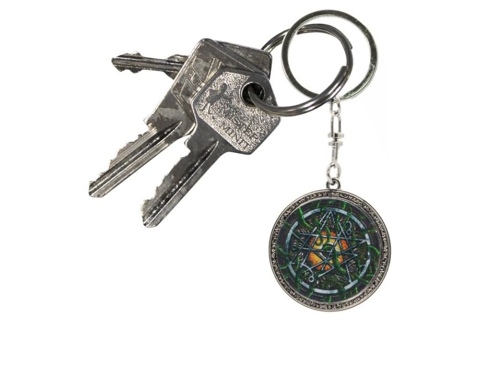 Jedinečná kovová klíčenka pro ctitele hororů Call of Cthulhu a díla H. P. Lovecrafta s lentikulární grafikou Necronomiconu.