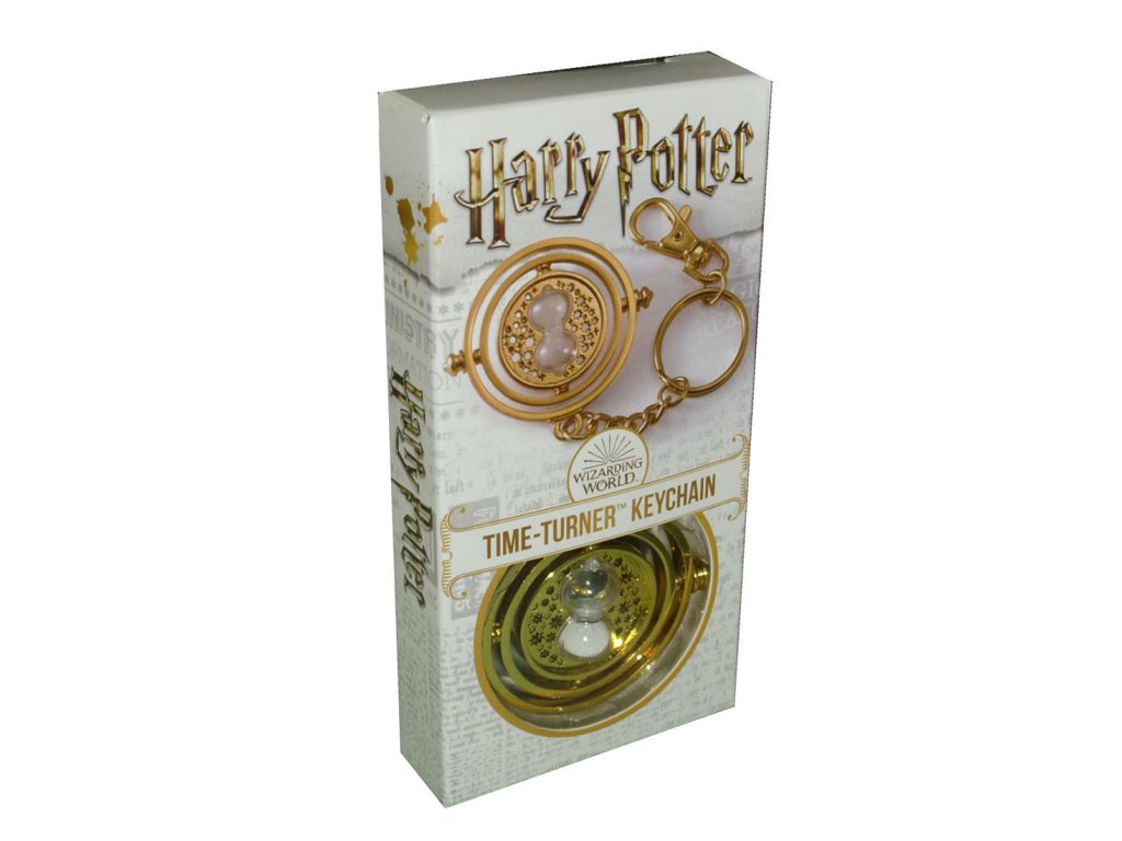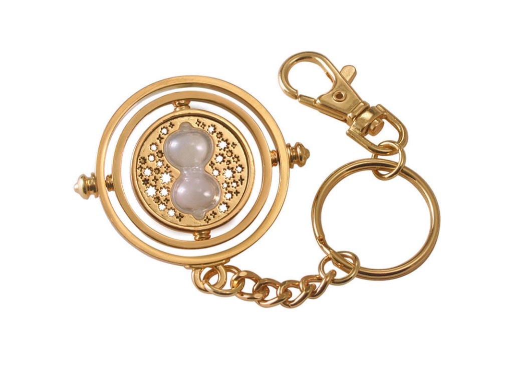 Klíčenka ve zlaté barvě s přívěskem Obraceče času (v původním znění Time Turner), jaký používala Hermiona Grangerová ve filmu Harry Potter a Vězeň z Azkabanu.