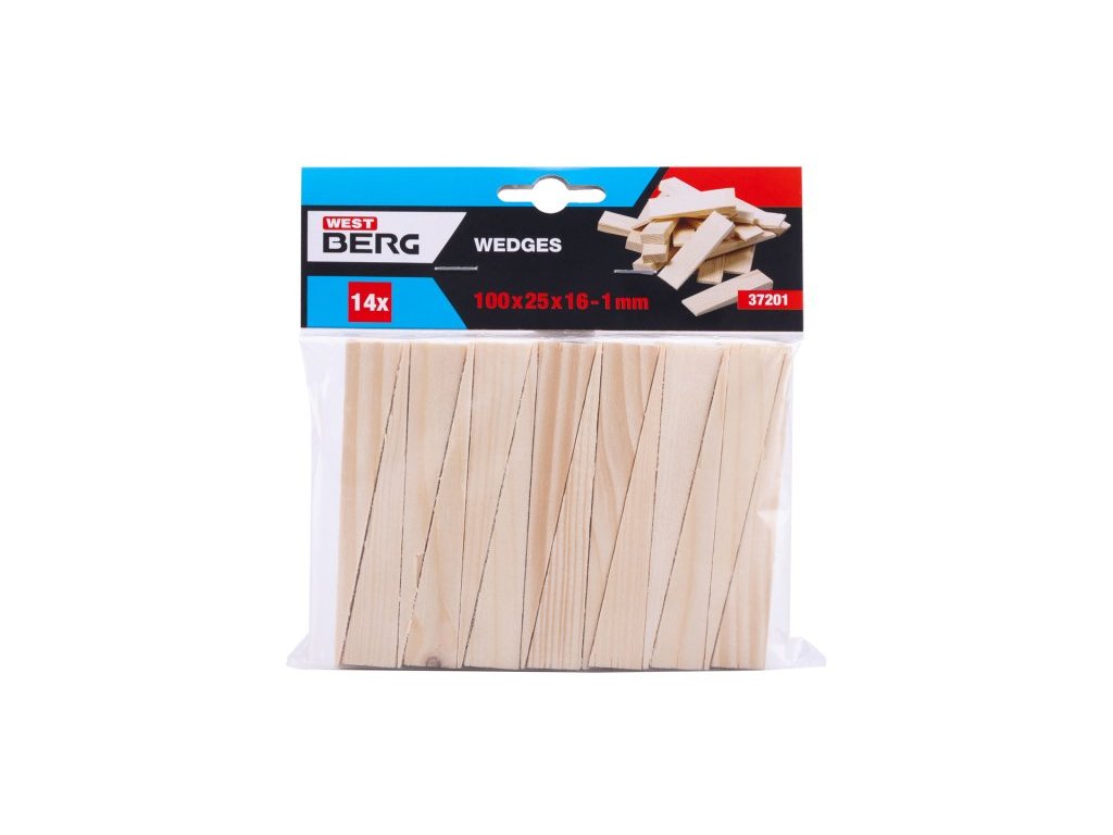 - Dřevěné klínky (smrk), rozměr : 100 x 25 x 1-16 mm, množství : 14 ks, použití : pro osazování oken, zárubní a kovových konstrukcí, balení : blistr s eurootvorem.