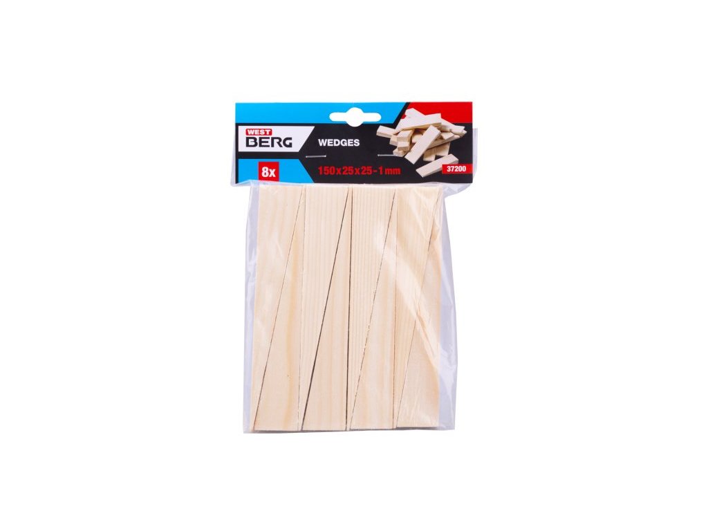 Dřevěné klínky (smrk), rozměr: 150 x 25 x 1-25 mm, množství: 8 ks, použití: pro osazování oken, zárubní a kovových konstrukcí, balení: blistr s eurootvorem.
