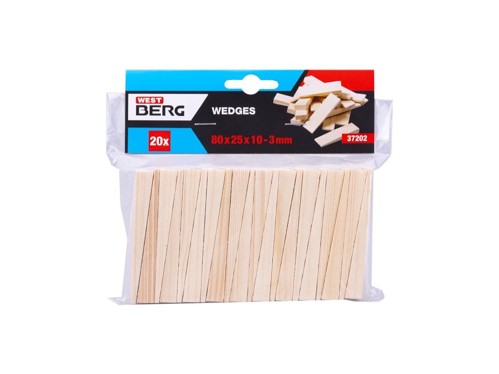 Dřevěné klínky (smrk), rozměr : 80 x 25 x 3-10 mm, množství : 20 ks, použití : pro osazování oken, zárubní a kovových konstrukcí, balení : blistr s eurootvorem.