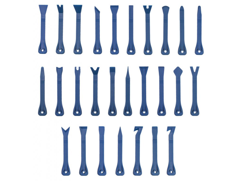 Sada 27 ks profesionálních nástrojů se speciálním profilem na demontáž vnitřních a vnějších příchytek plastových a čalouněných částí automobilů.
