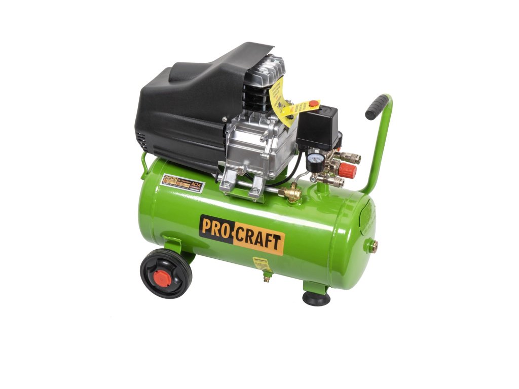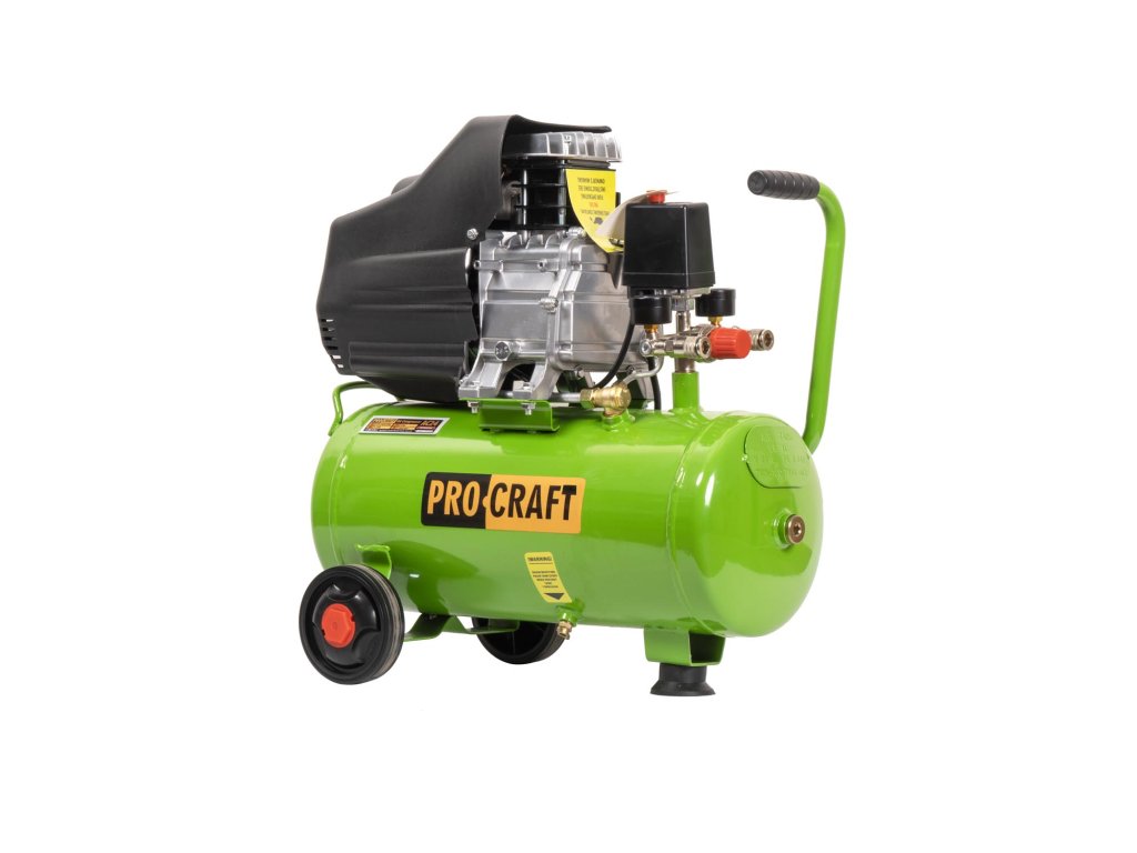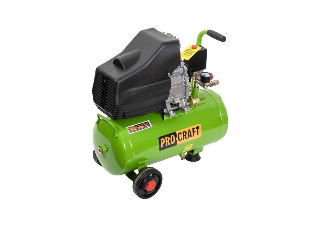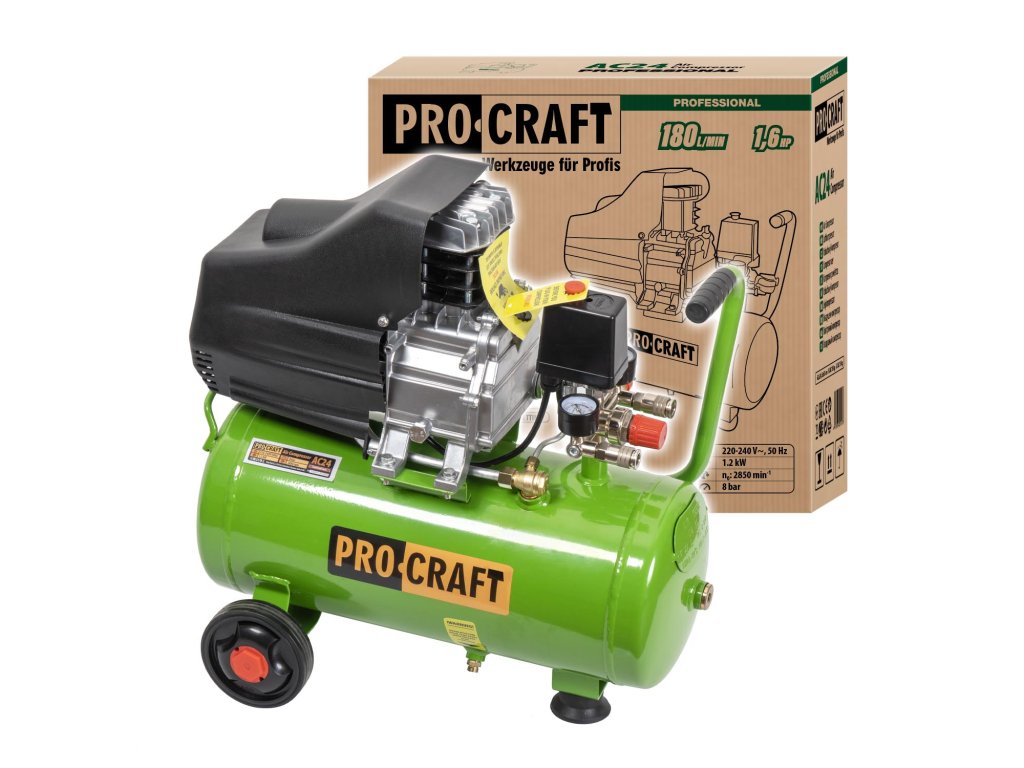 Kompresor Procraft AC24 je určen ke stlačení vzduchu pro provoz pneumatického nářadí, huštění pneumatik. Silný motor s výkonem 1200 W zaručuje vysoký sací výkon až 196 l/min. Mazání olejem zvyšuje životnost kompresoru, a optický ukazatel usnadňuje kontrolu jeho stavu. Regulace výše pracovního tlaku umožňuje nastavení optimálních parametrů podle zvoleného vzduchového nářadí. Rychlospojky vývodů usnadňují a zrychlují práce. Součástí dodávky jsou přepravní kola, pryžové botky. Balení karton.