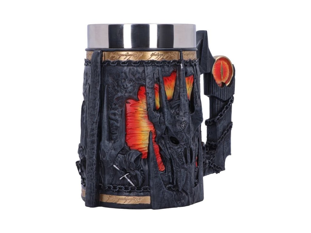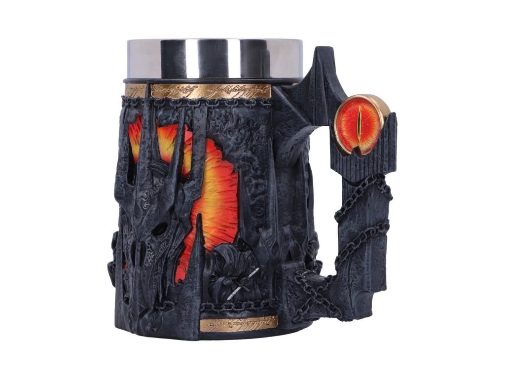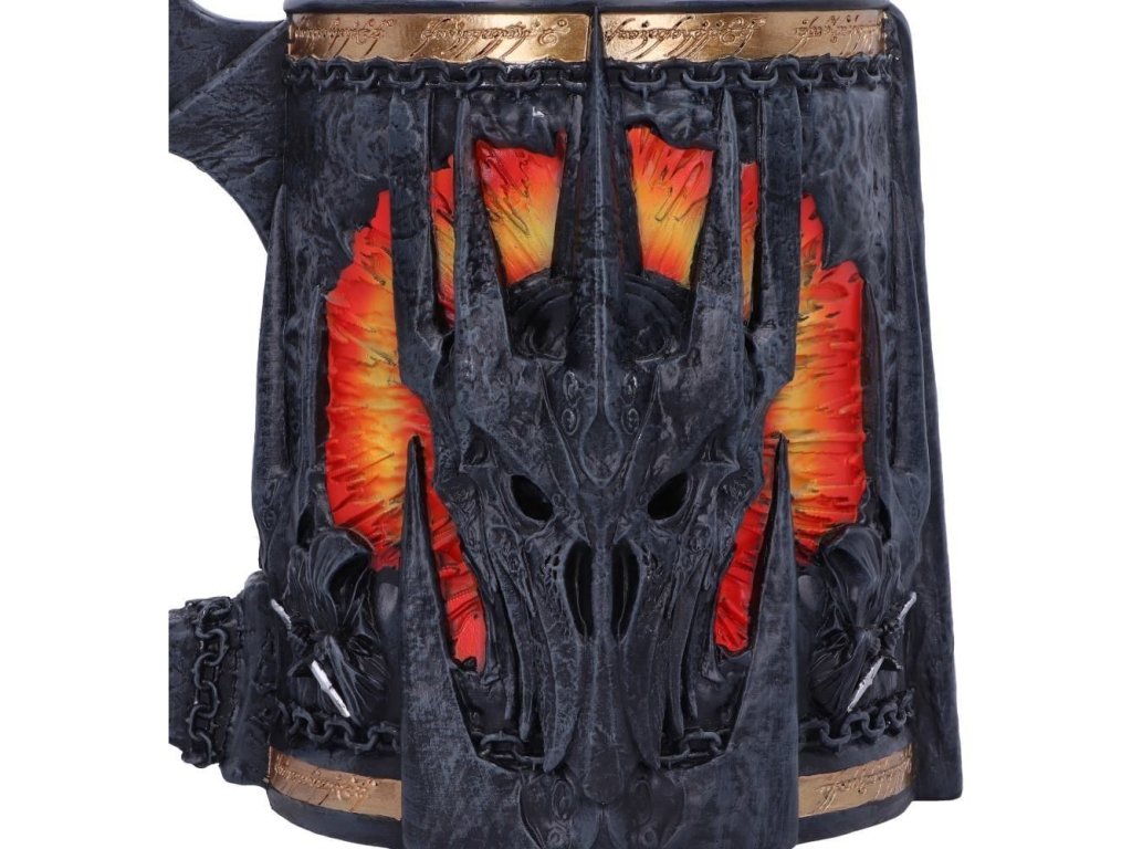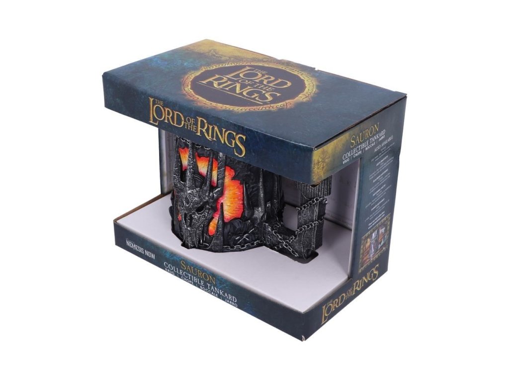 Sauronův korbel se spoustou pěkných detailů bude jedinečným dárkem pro fanoušky fantasy ságy Pán prstenů! Korbel zdobí maska Temného pána z Mordoru, doprovázená dvojicí Nazgûlů - Prstenových přízraků. Horní část lemuje zlatý proužek s nápisem z Prstenu: Jeden prsten vládne všem... Korbel má uvnitř vyjímatelný nerezový insert, což umožňuje jeho snadnou údržbu. Korbel není vhodný do mikrovlnné trouby ani do myčky nádobí.