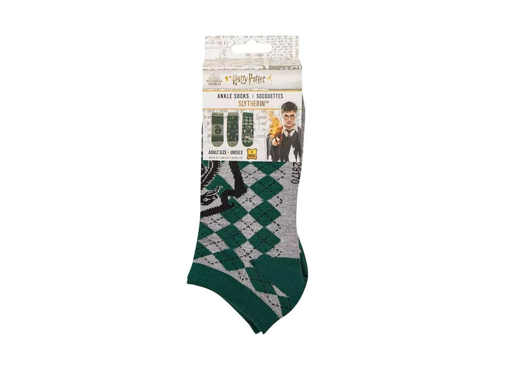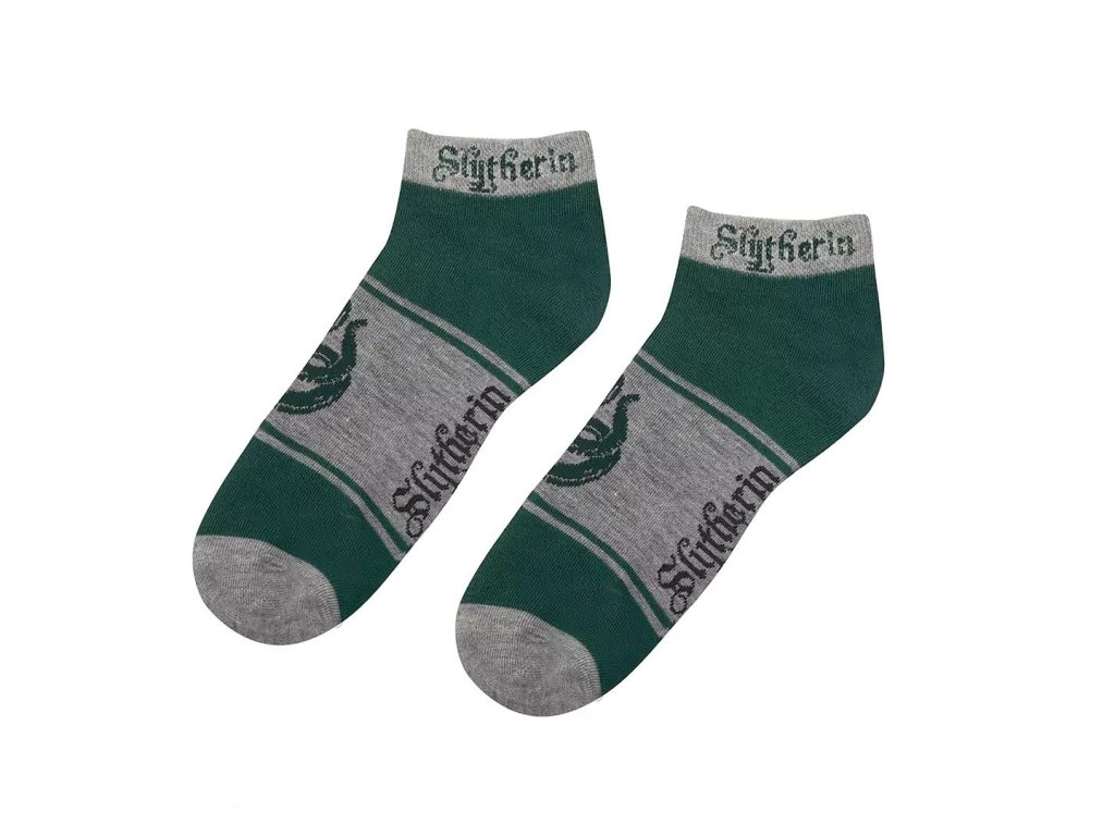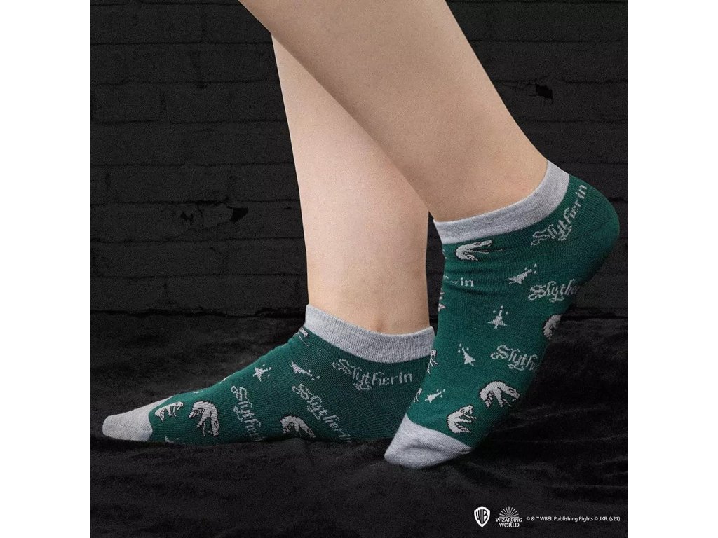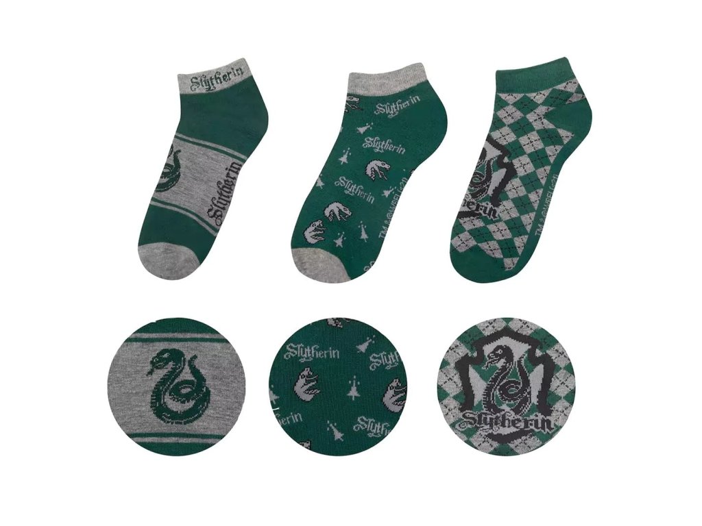 Sada obsahuje 3 páry kotníkových ponožek s grafikou koleje Zmijozel z bradavické školy čar a kouzel. Skvělý doplněk šatníku pro čarodějky, mágy a fanoušky příběhů o Harry Potterovi. Ponožky mají jednu univerzální velikost (US 4-11 / EU 35-45 / UK/IRL 2-10).