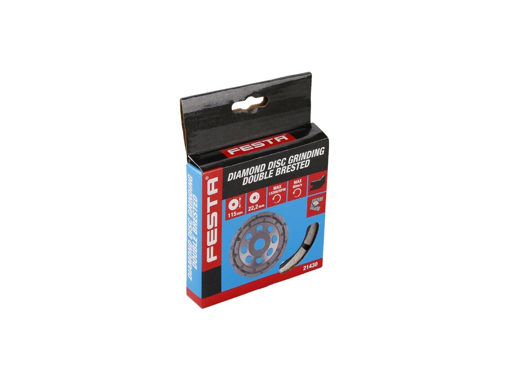 Brusný diamantový kotouč FESTA -dvouřadý, robustní nosný talíř je z pevné slitiny, speciální konstrukce uchycení diamantových segmentů k nosnému disku kotouče, vysoký obsah diamantového prachu v segmentech, použití: pro suché i mokré broušení mramoru, žuly, cihel, zdiva, přírodního i umělého kamene, obkladů, dlažeb, betonu..., tvar a provedení segmentů je vhodné pro hrubé a rchlé obrušování, rozměry: uvedeny v názvu výrobku, balení: papírový box s eurootvorem.