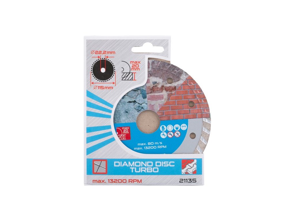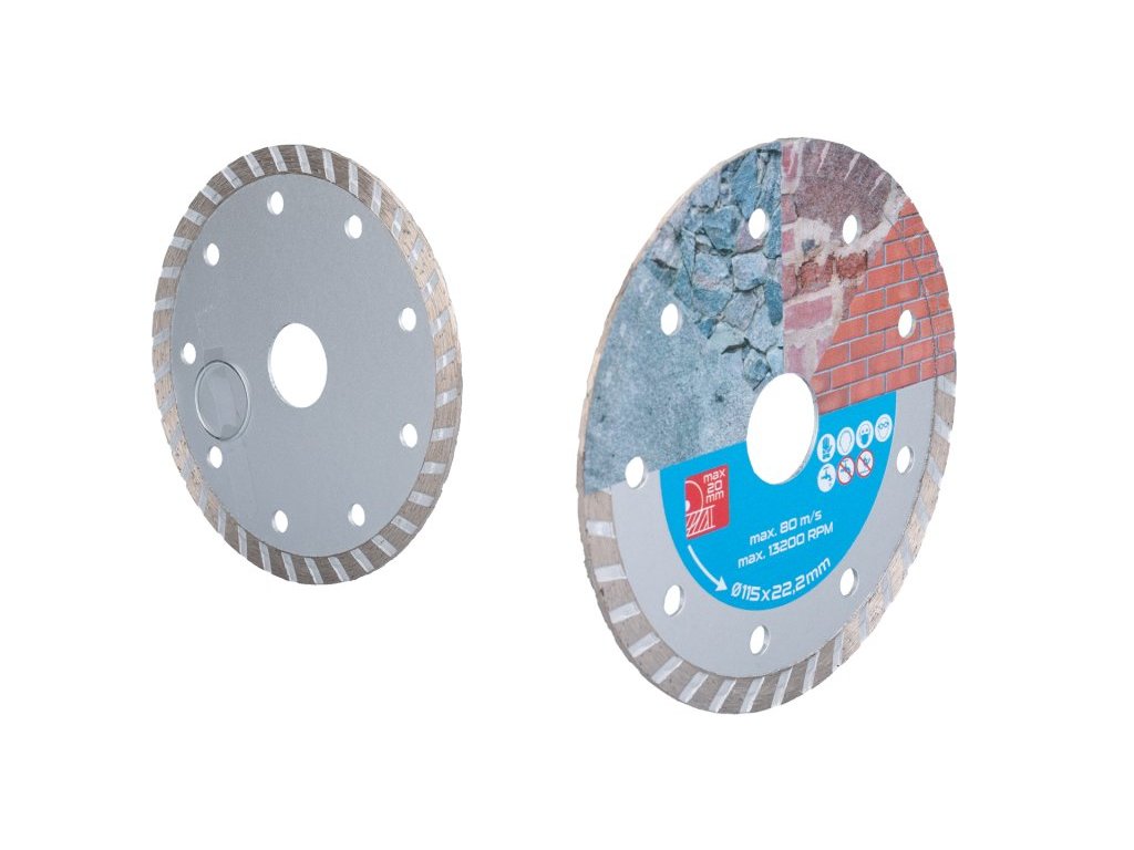 Diamantový kotouč DIAMANT, provedení : TURBO, kvalitní materiály i zpracování, speciální tvar diamantových segmentů i konstrukce a pevné uchycení k nosnému disku kotouče, vysoký obsah diamantového prachu, použití : pro suché i mokré řezání betonu, železobetonu cihel, zdiva, kamene, balení : blistr s eurootvorem, přiložen redukční kroužek z 22,2 na 20 mm, rozměry : uvedeny v názvu výrobku.