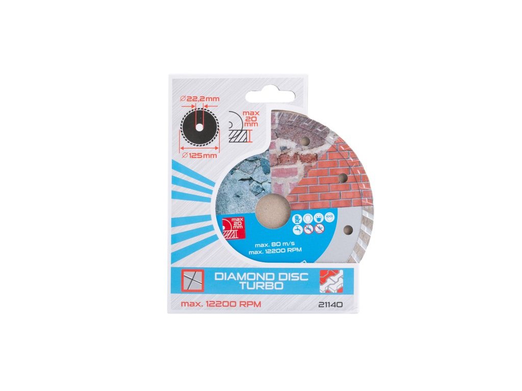 Diamantový kotouč DIAMANT, provedení : TURBO, kvalitní materiály i zpracování, speciální tvar diamantových segmentů i konstrukce a pevné uchycení k nosnému disku kotouče, vysoký obsah diamantového prachu, použití : pro suché i mokré řezání betonu, železobetonu cihel, zdiva, kamene, balení : blistr s eurootvorem, přiložen redukční kroužek z 22,2 na 20 mm, rozměry : uvedeny v názvu výrobku.