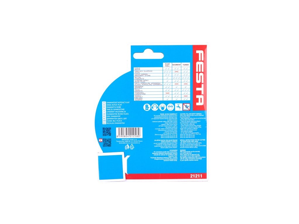 Profesionální diamantový kotouč FESTA, provedení : PLNÝ - celoobvodový, kvalitní diamantová vrstva s vysokým obsahem diamantového prachu, přesné zpracování - napojení na nosný disk kotouče odolávající vysokým teplotám, použití : určený pro mokré i suché řezání dlažby a obkladů, betonu, cihel, zdiva, žuly, mramoru, kamene, skla, keramiky, balení : blistr s eurootvorem, rozměry : uvedeny v názvu výrobku.