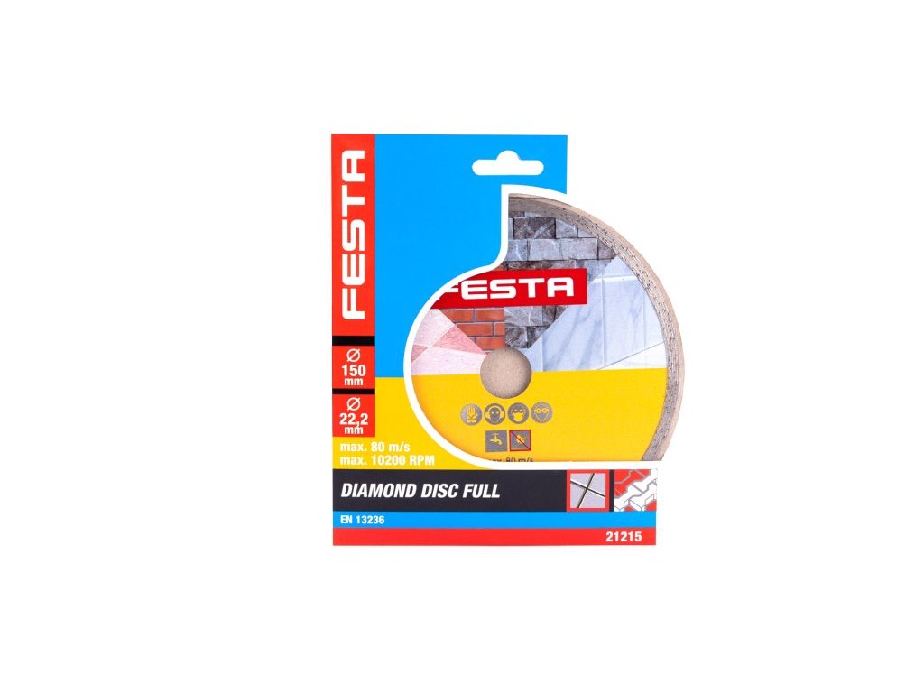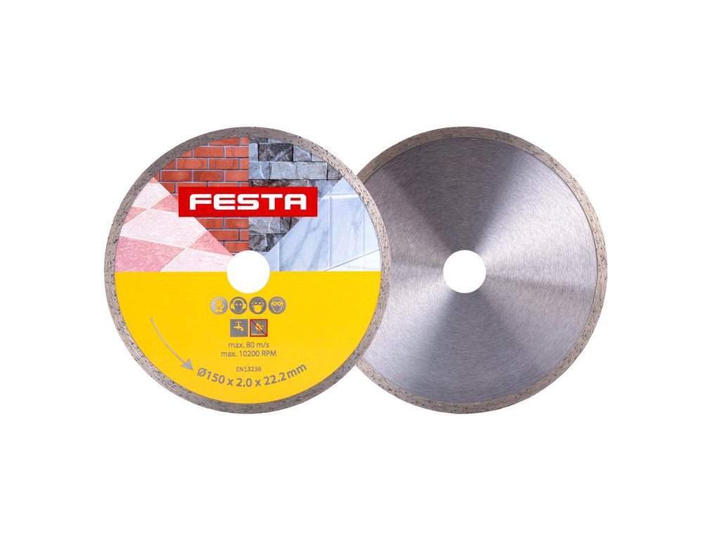 Profesionální diamantový kotouč FESTA, provedení : PLNÝ - celoobvodový, kvalitní diamantová vrstva s vysokým obsahem diamantového prachu, přesné zpracování - napojení na nosný disk kotouče odolávající vysokým teplotám, použití : určený pro mokré i suché řezání dlažby a obkladů, betonu, cihel, zdiva, žuly, mramoru, kamene, skla, keramiky, balení : blistr s eurootvorem, rozměry : uvedeny v názvu výrobku.