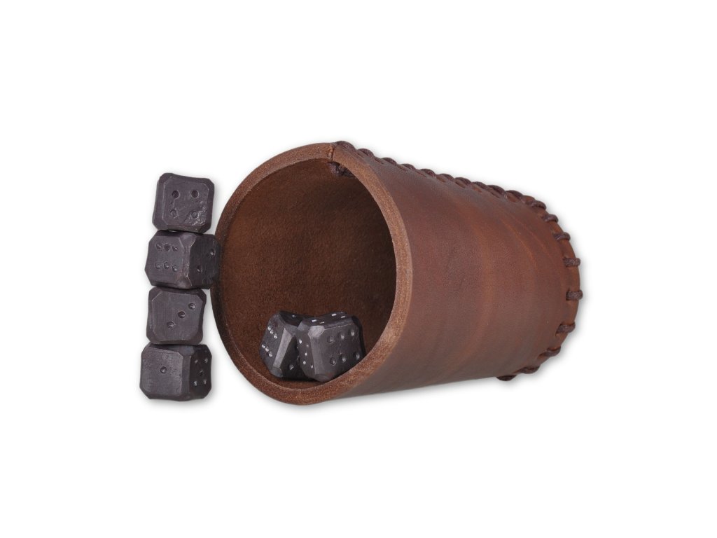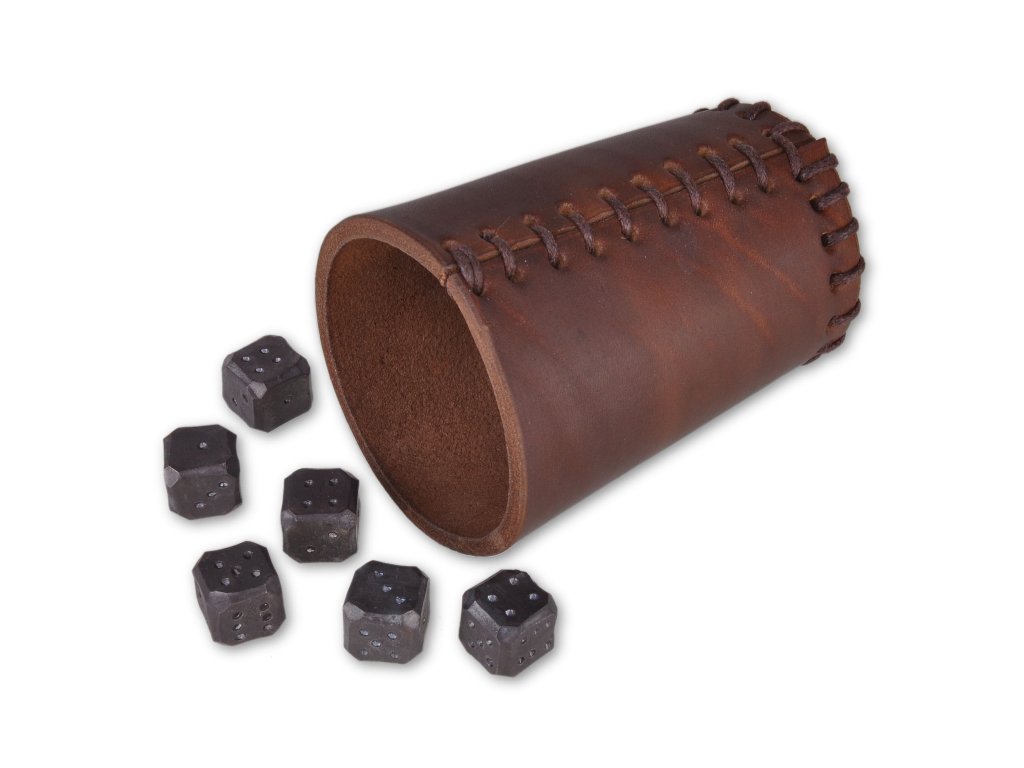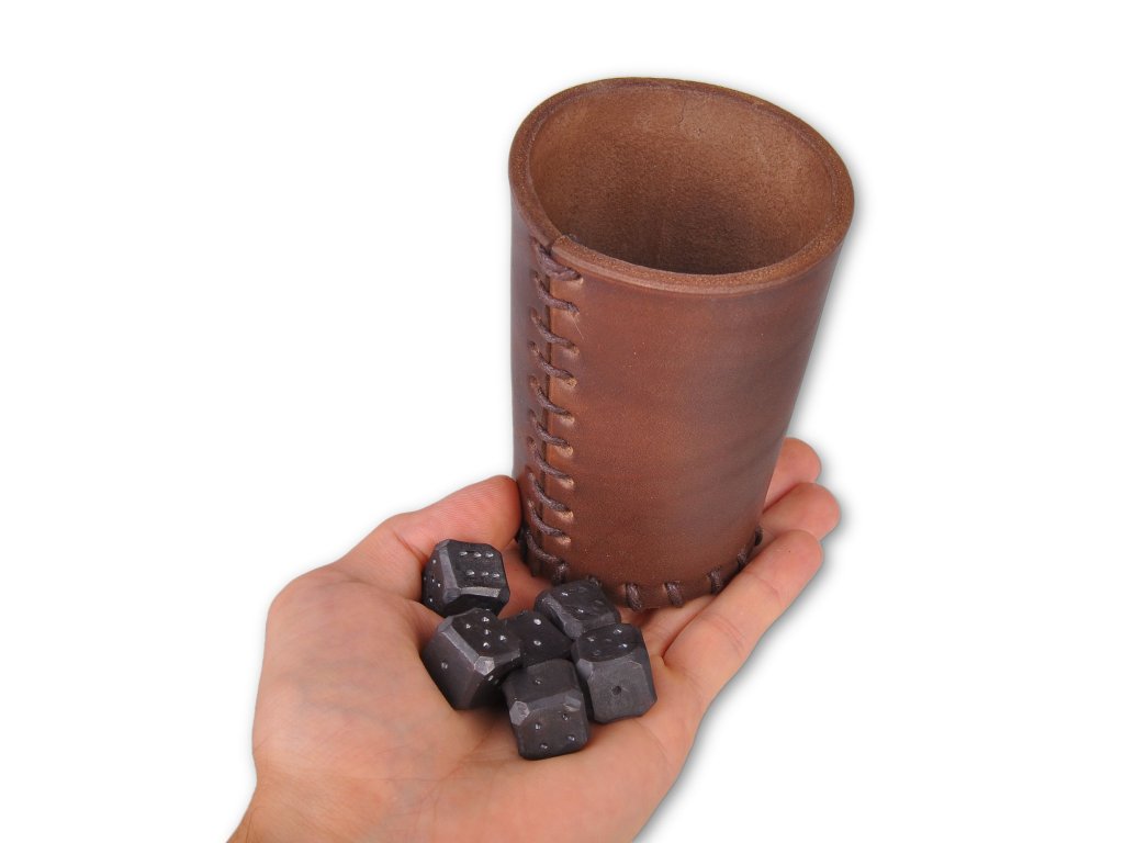 Stylový dárek - sada šesti kovaných kostek s koženým kalíškem. Kostky jsou ručně kované, jejich povrch je opatřen voskem. Sada se hodí pro všelijaké kostkové hry. Ruční výroba z naší dílny! výška kelímku: 10 cm průměr kelímku: 8 cm průměr kostky: 1,5 cm