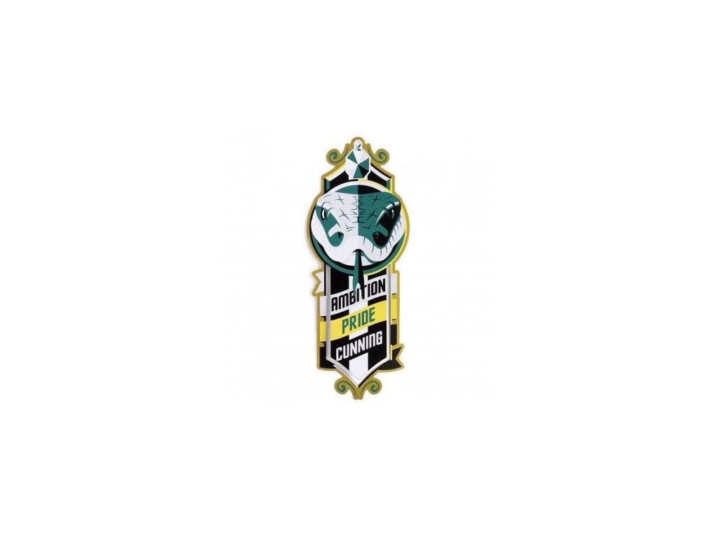 Stylová knižní záložka z nerezové oceli pro milovníky magického světa Harry Pottera na sobě nese grafiku insignie koleje Zmijozel z bradavické školy čar a kouzel.