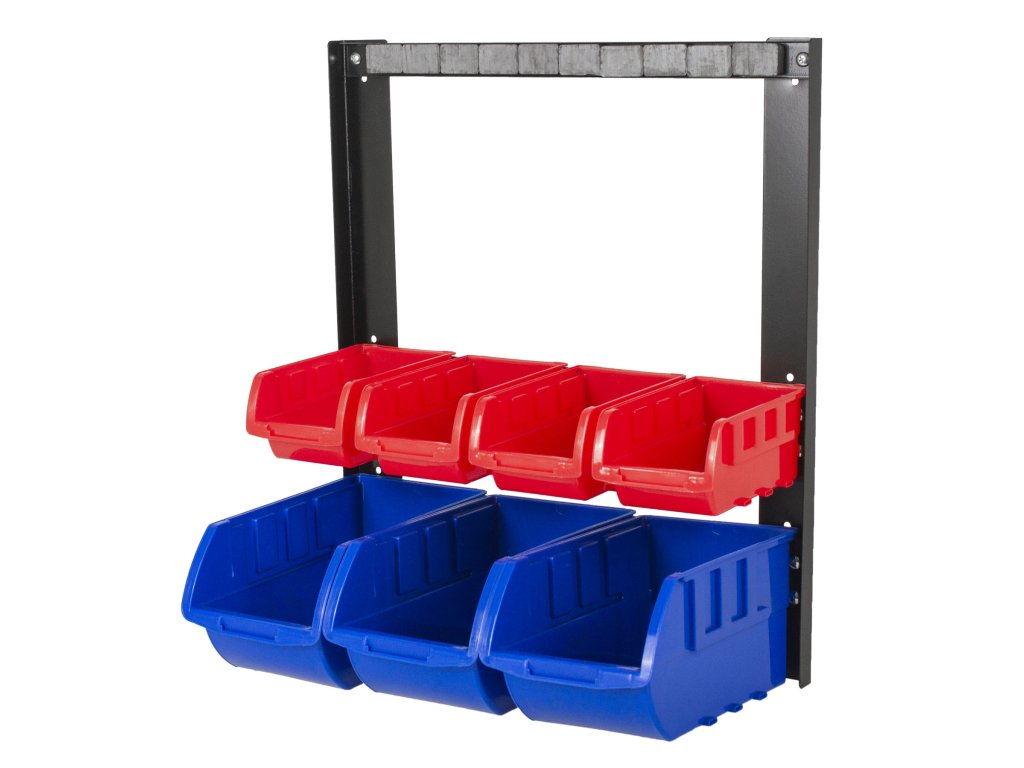 Kovový rám regálu s plastovými boxy a magnetickou lištou pro dokonalou organizaci v dílně. Rozměry: 457 x 243 x 413 mm (Š x H x V).
