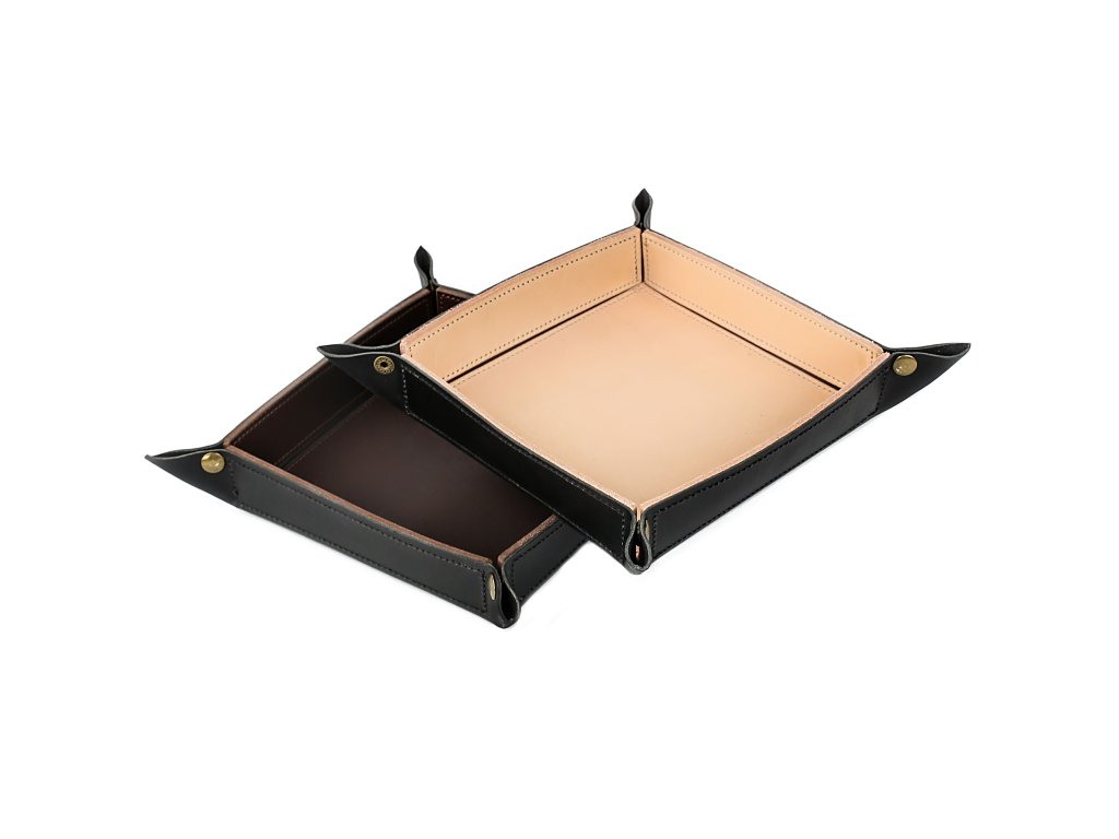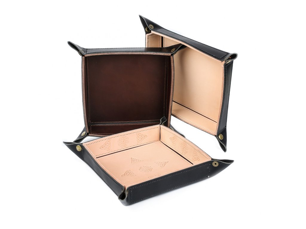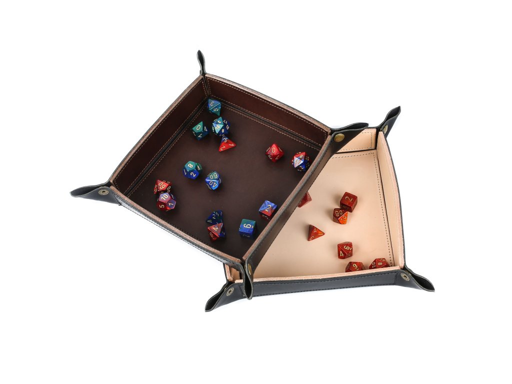 Praktická skládací kožená podložka na házení kostek - tzv. dice tray. Hodí se všude tam, kde se hází kostkami - při hraní deskových či kostkových her nebo RPG - her na hrdiny. Díky podložce vám kostky nelétají všude po stole, máte je vždy při ruce a hozený výsledek je pěkně čitelný. Kožená varianta je velice odolná a v neposlední řadě hezky vypadá. Podložky vyrábíme ručně v naší dílně, k mání jsou ve dvou variantách - jedna má na vnitřní straně světlou přírodní kůži (vhodná pro tmavé kostky), druhá má hnědou probarvenou kůži (ideální pro světlé kostky). Složená podložka má rozměry 19 x 19 cm, výška okraje je 4 cm. V rozloženém stavu je velikost 25 x 25 cm.