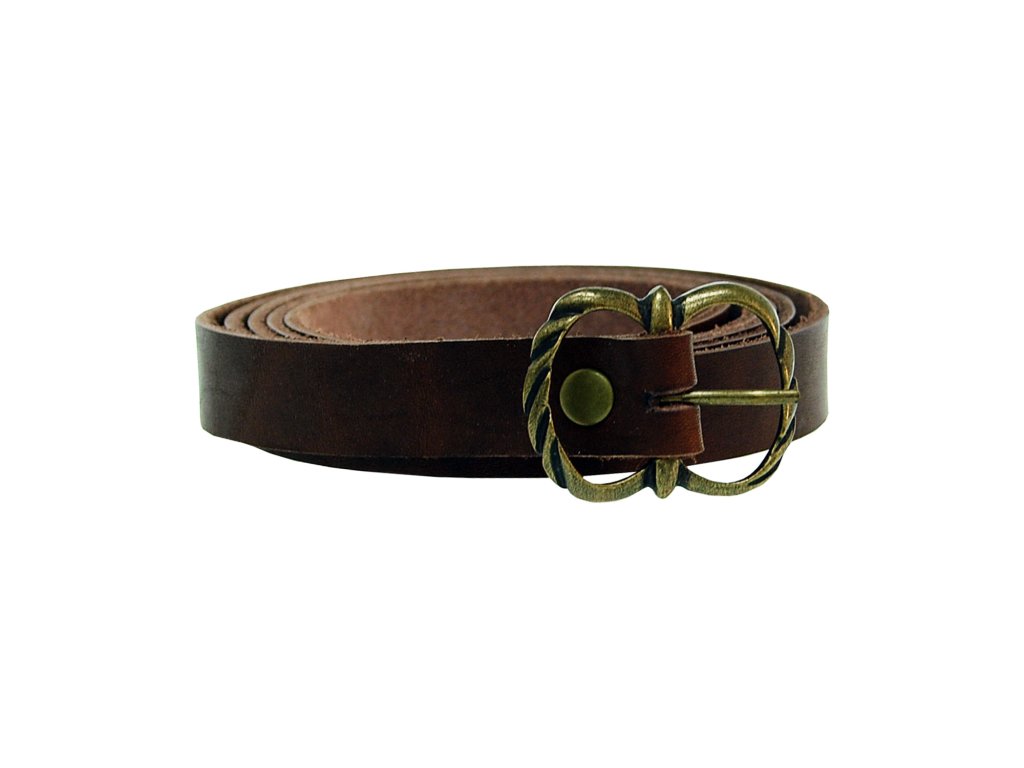 Opasek z pravé hovězí kůže opatřený jednoduchou elegantní pewterovou sponou. Je ideální kupříkladu k prostým či dětským kostýmům. Není tak široký, jako naše ostatní opasky (má šířku 2 cm), spona je pewterová. Opasek je k mání je v několika barevných variantách, takže bude pasovat k takřka jakémukoli kostýmu. Vyrábíme jej v naší dílně ve standardní délce 150 cm, po domluvě však můžeme vyrobit i jinou délku opasku (maximální délka je 180 cm).