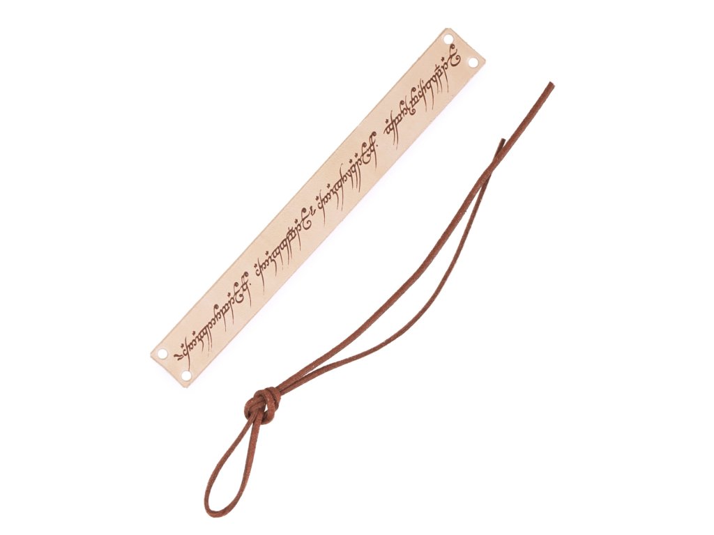 Tento stylový kožený náramek Jeden prsten vás rozhodně do temnoty nesváže! Originální kožený náramek vznikl v naší kožedělné dílně, kde temnota a Saruman mají vstup odepřen. Kožený náramek z lakované hovězí kůže o šířce 2 cm s nápisem z Prstenu moci nadchne každého fanouška Pána prstenů. Náramek je dlouhý 18 cm a zavazuje se pomocí kožené šňůrky. Na přání lze obvod upravit.
