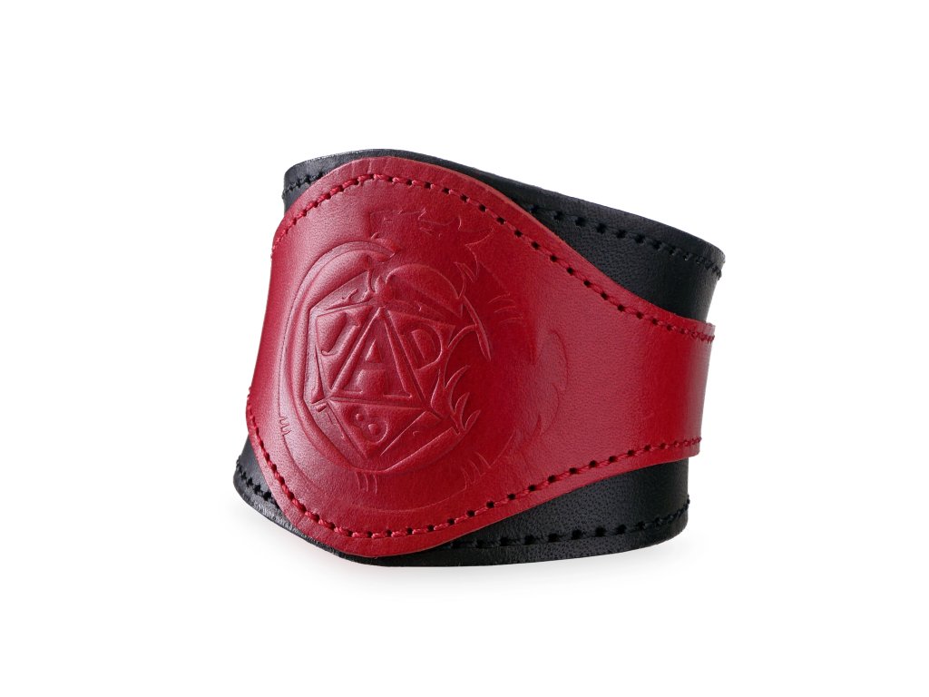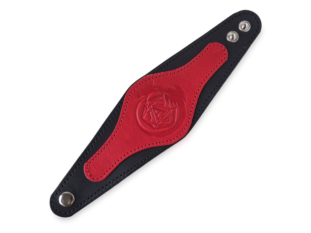 Stylový červeno-černý náramek Jeskyně a draci jsme pro vás vyrobili v naší dílně z pravé hovězí kůže, která je vhodná pro každodenní nošení. V nejširším místě s dračím znakem je náramek široký 6 cm a postupně se směrem k zapínání zužuje až na 3 cm. Kovový cvoček umožňuje dvě délky zapínání na obvod 20 cm a 22 cm. Náramek je ozdobený vyraženým logem hry na hrdiny Jeskyně a draci. Díky dračímu znaku s dvacetistěnnou kostkou ale udělá radost každému fanouškovi RPG, fantasy a okřídlených ještěrek. Snadno ho využijete také jako doplněk kostýmu na LARP, dřevárnu nebo maškarní ples. Elegantní náramek snadno sladíte i s civilním oblečením a využijete ho jako doplněk pro běžné nošení.